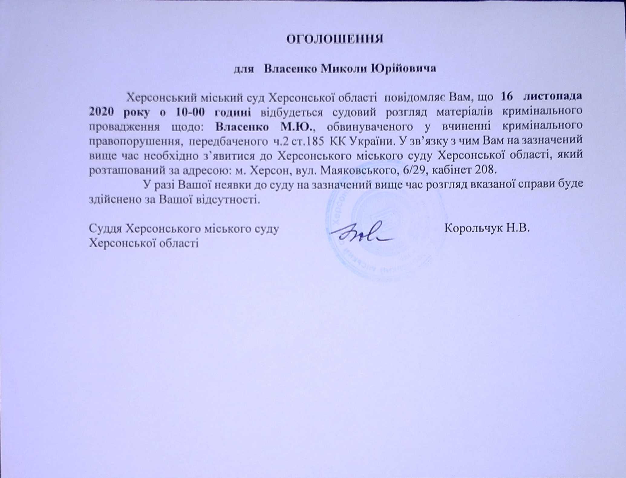 ОГОЛОШЕННЯ для Власенко Миколи Юрійовича