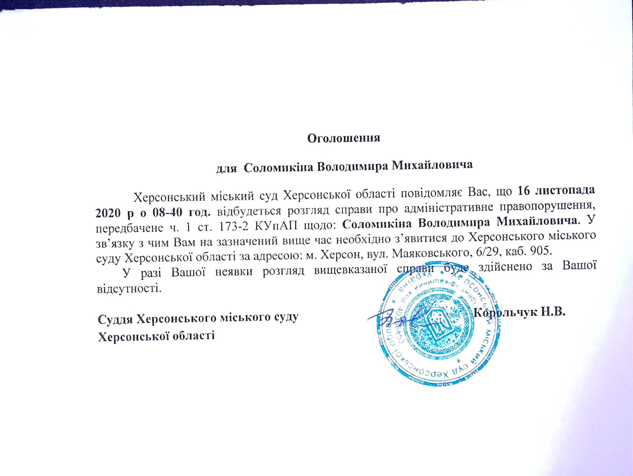 ОГОЛОШЕННЯ ПРО ВИКЛИК ДО СУДУ