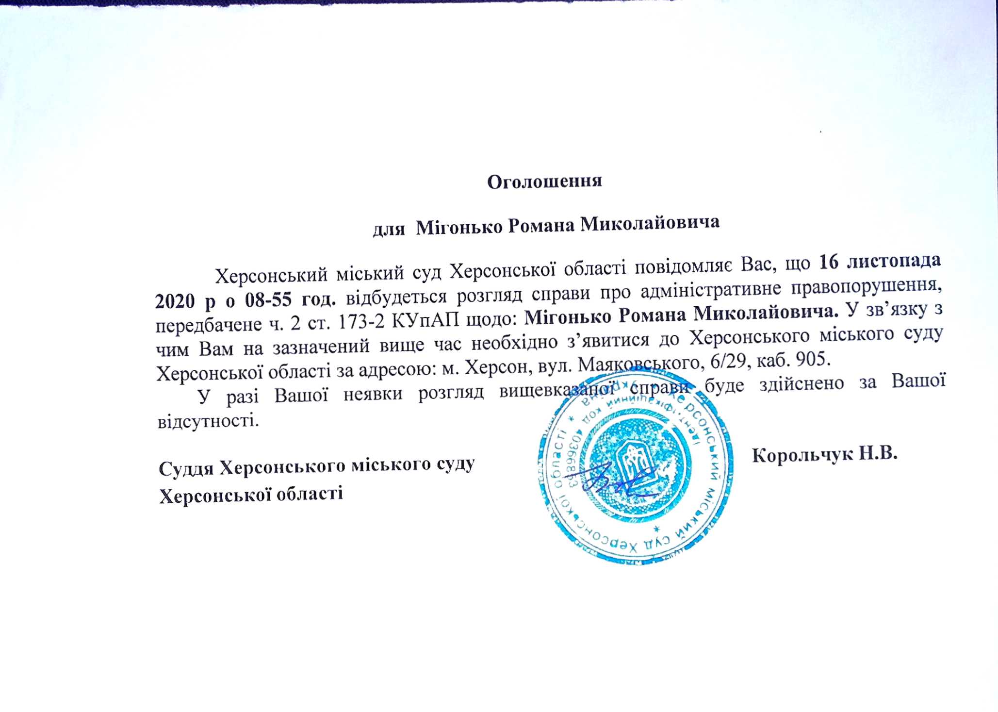 ОГОЛОШЕННЯ для Мігонько Романа Миколайовича