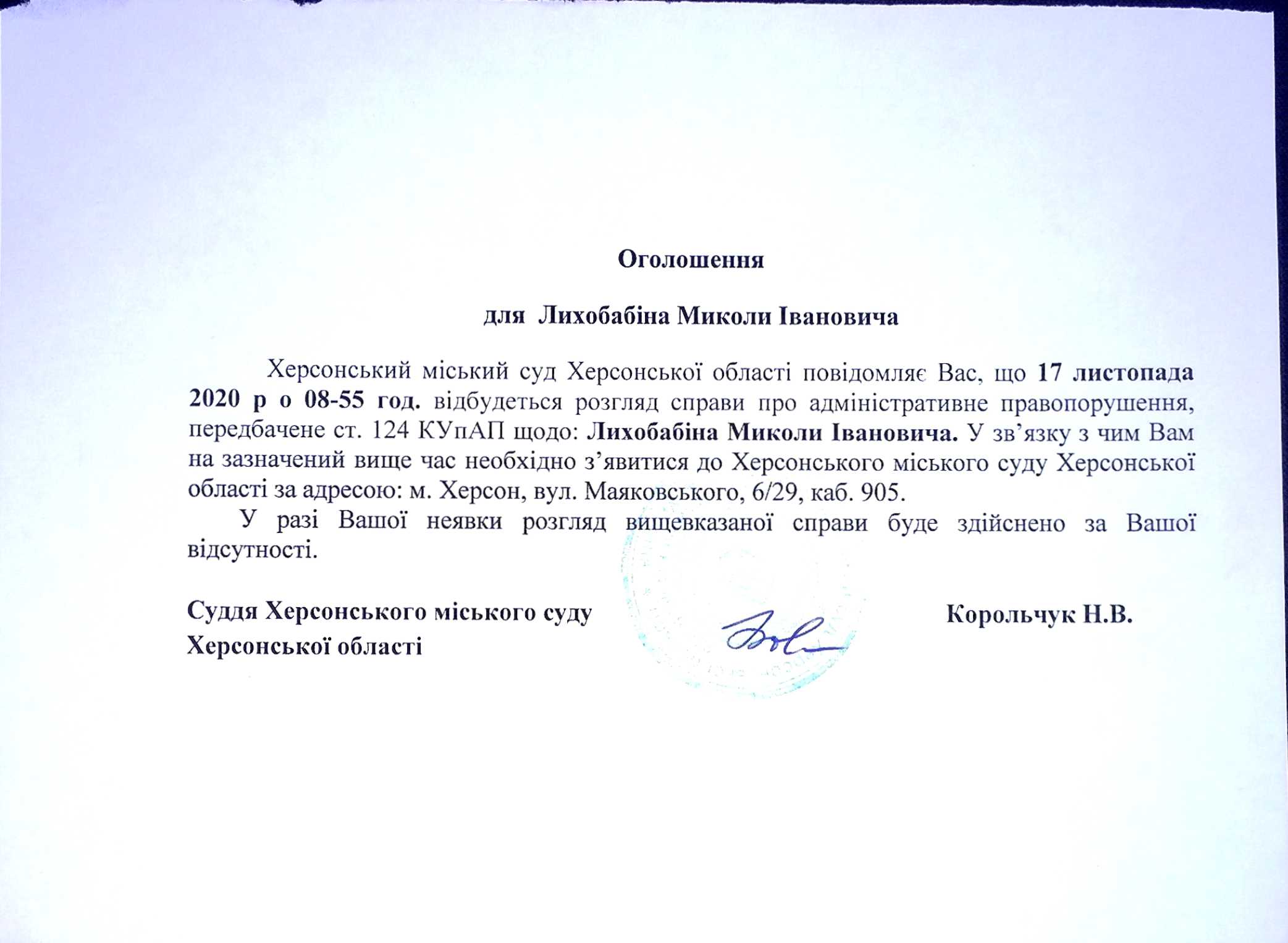 ОГОЛОШЕННЯ для Лихобабіна Миколи Івановича