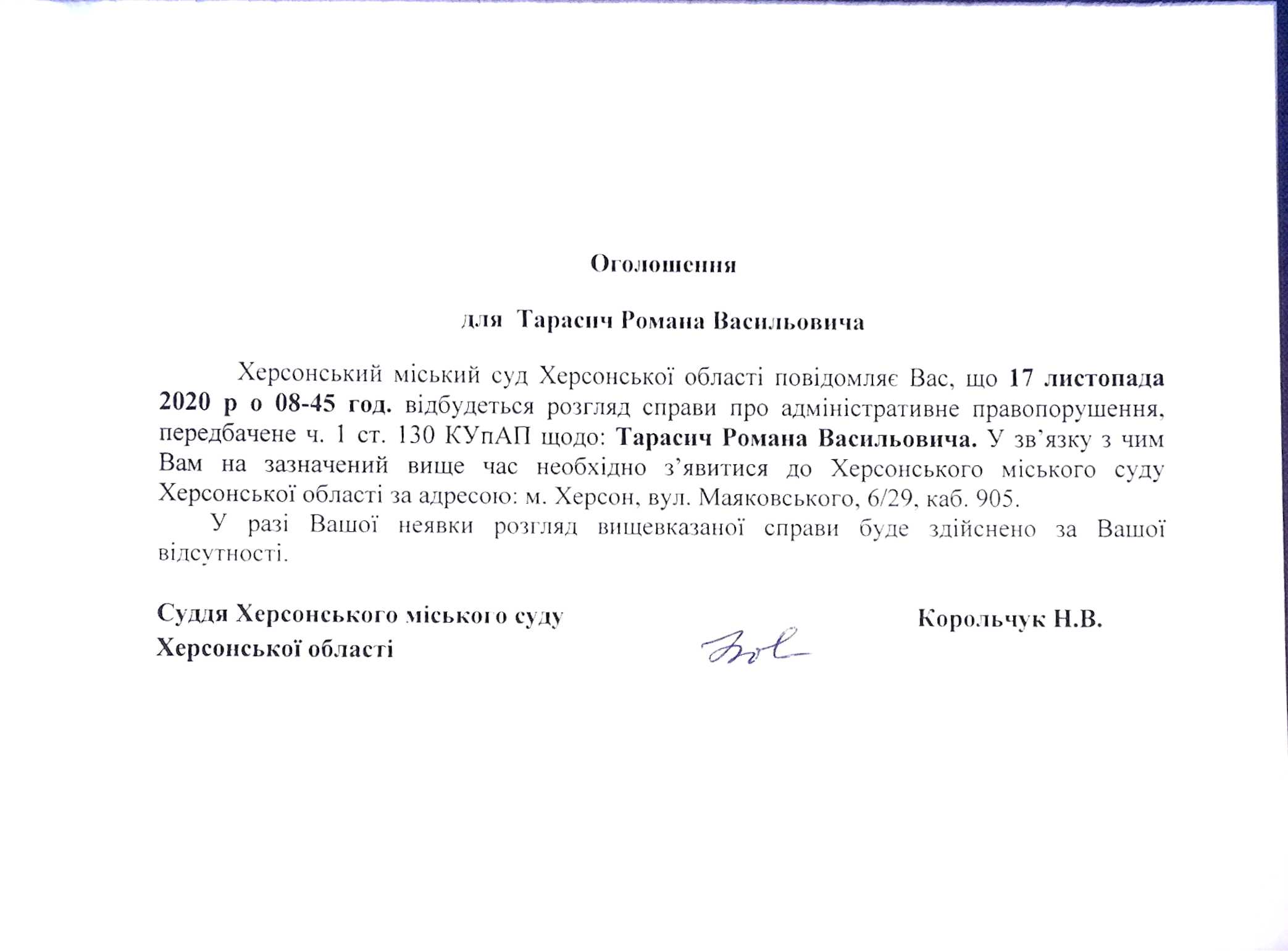 ОГОЛОШЕННЯ ПРО ВИКЛИК ДО СУДУ