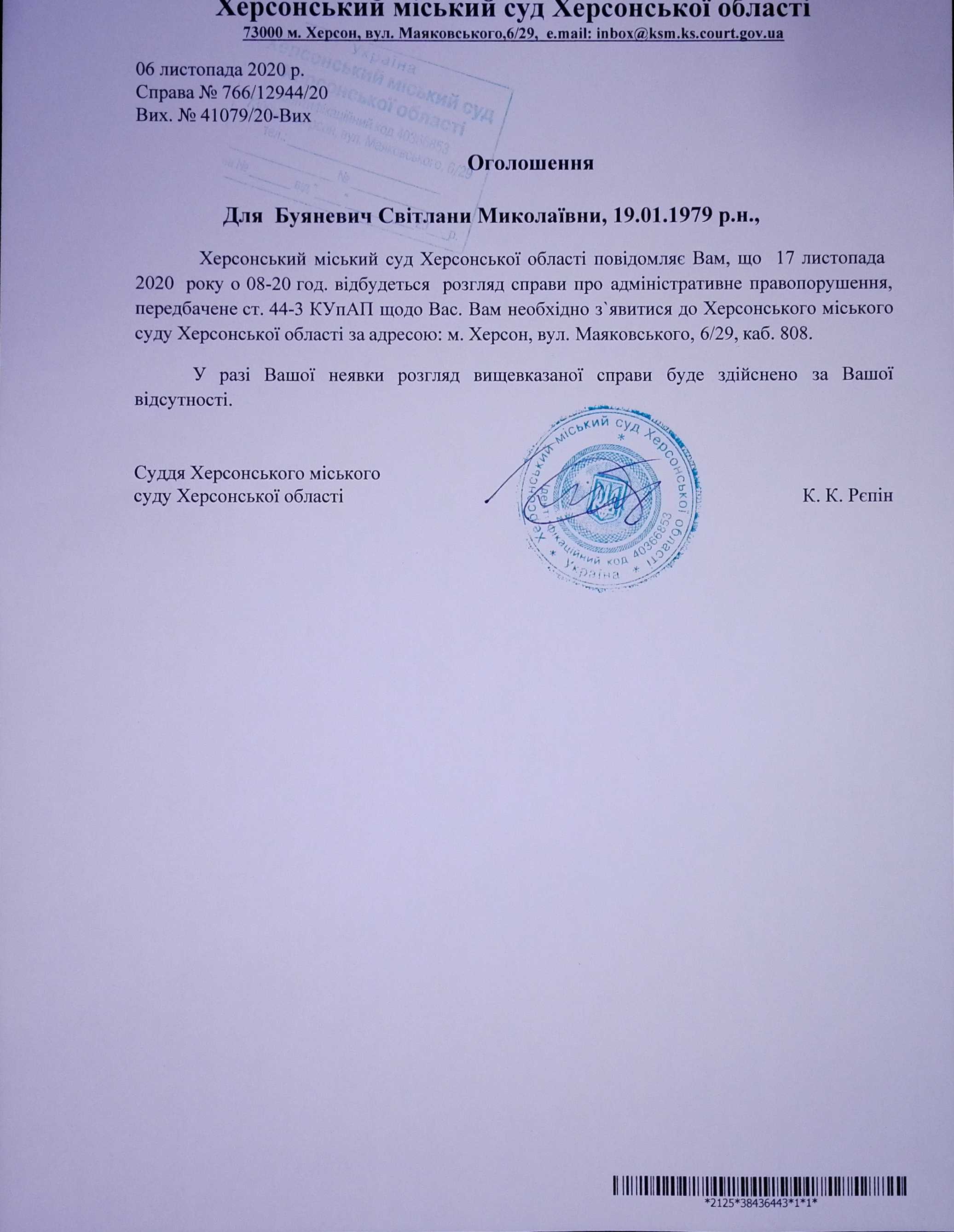 ОГОЛОШЕННЯ ПРО ВИКЛИК ДО СУДУ