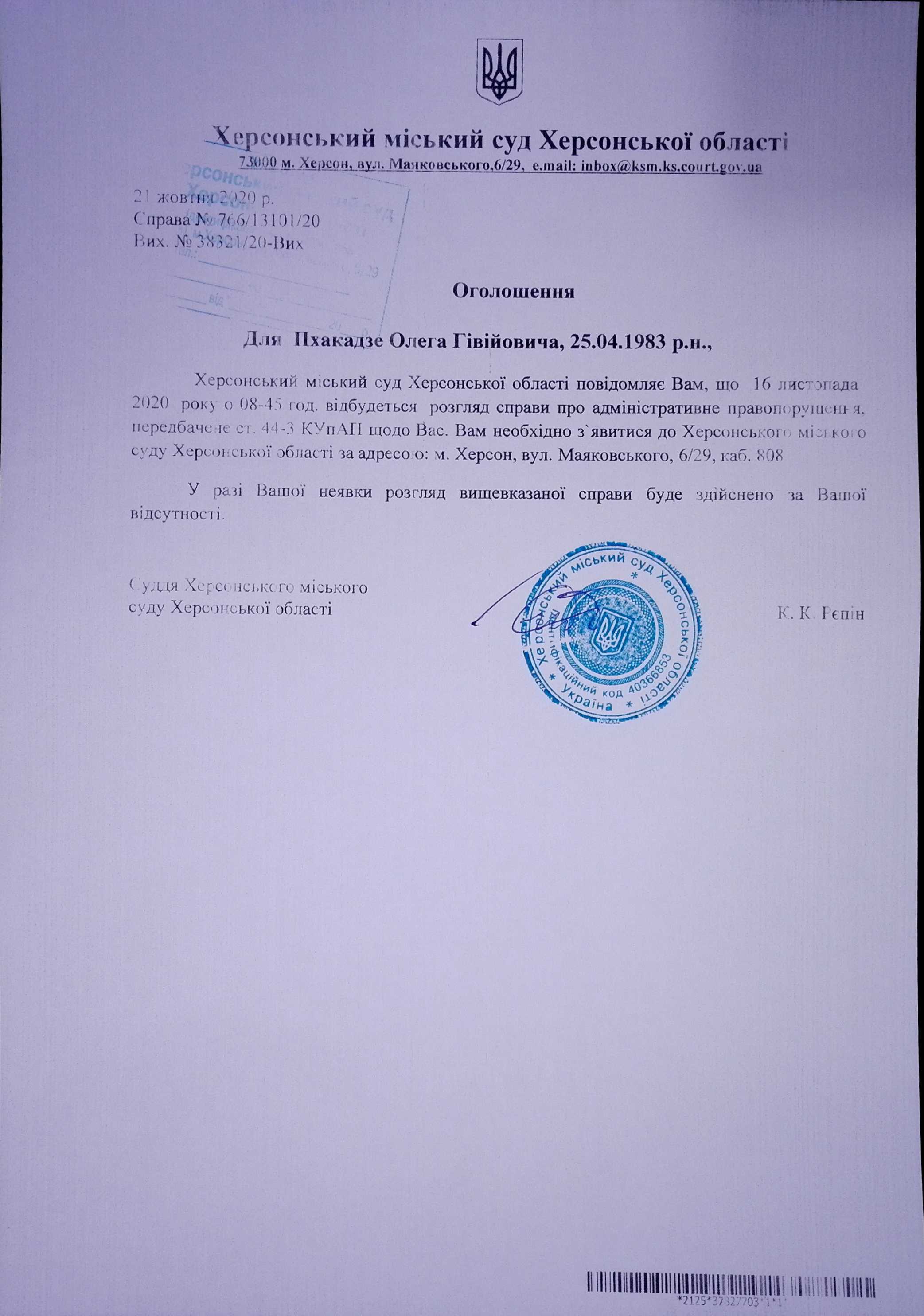 ОГОЛОШЕННЯ для Пхакадзе Олега Гівійовича