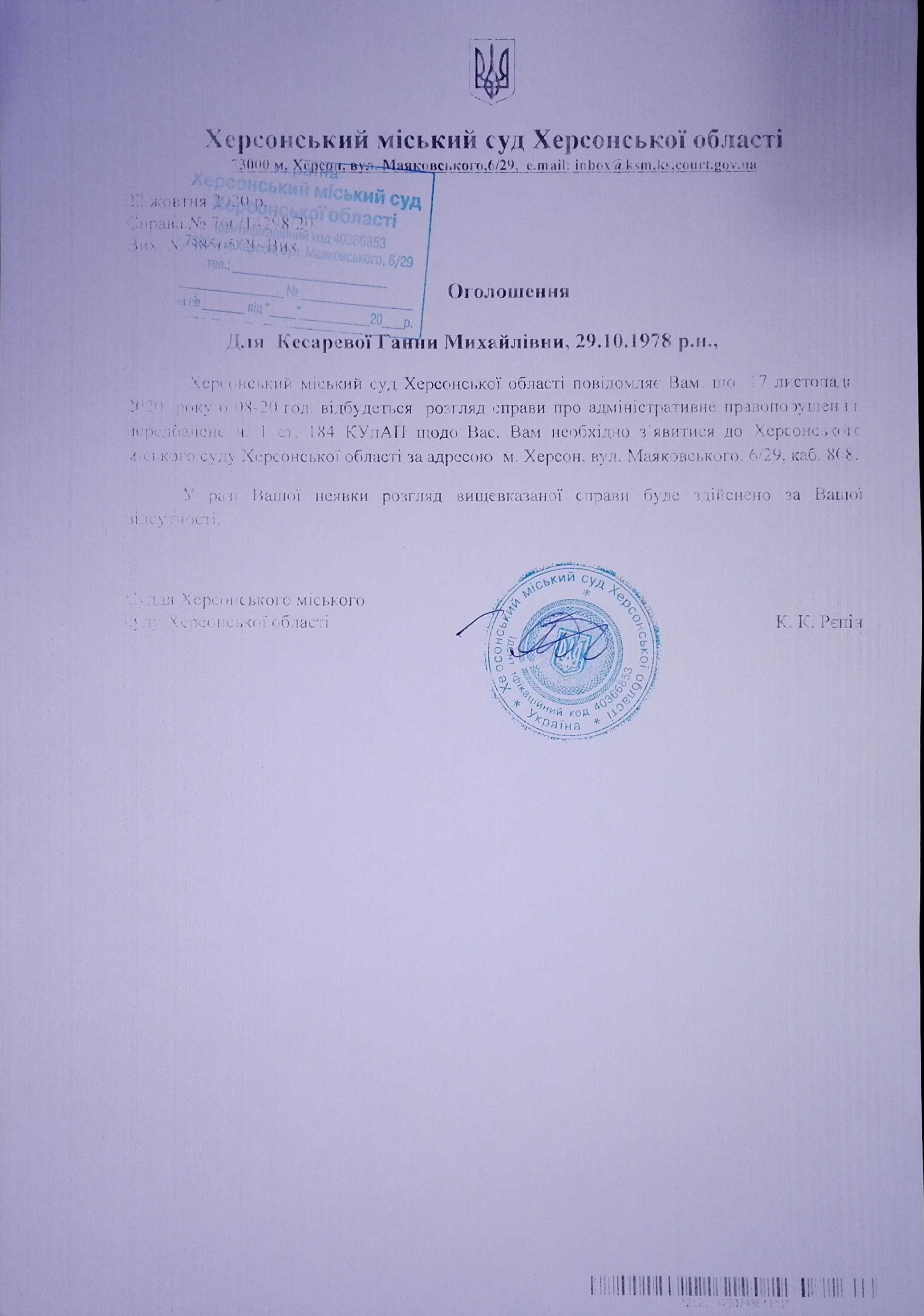 ОГОЛОШЕННЯ для Кесаревої Ганни Михайлівни