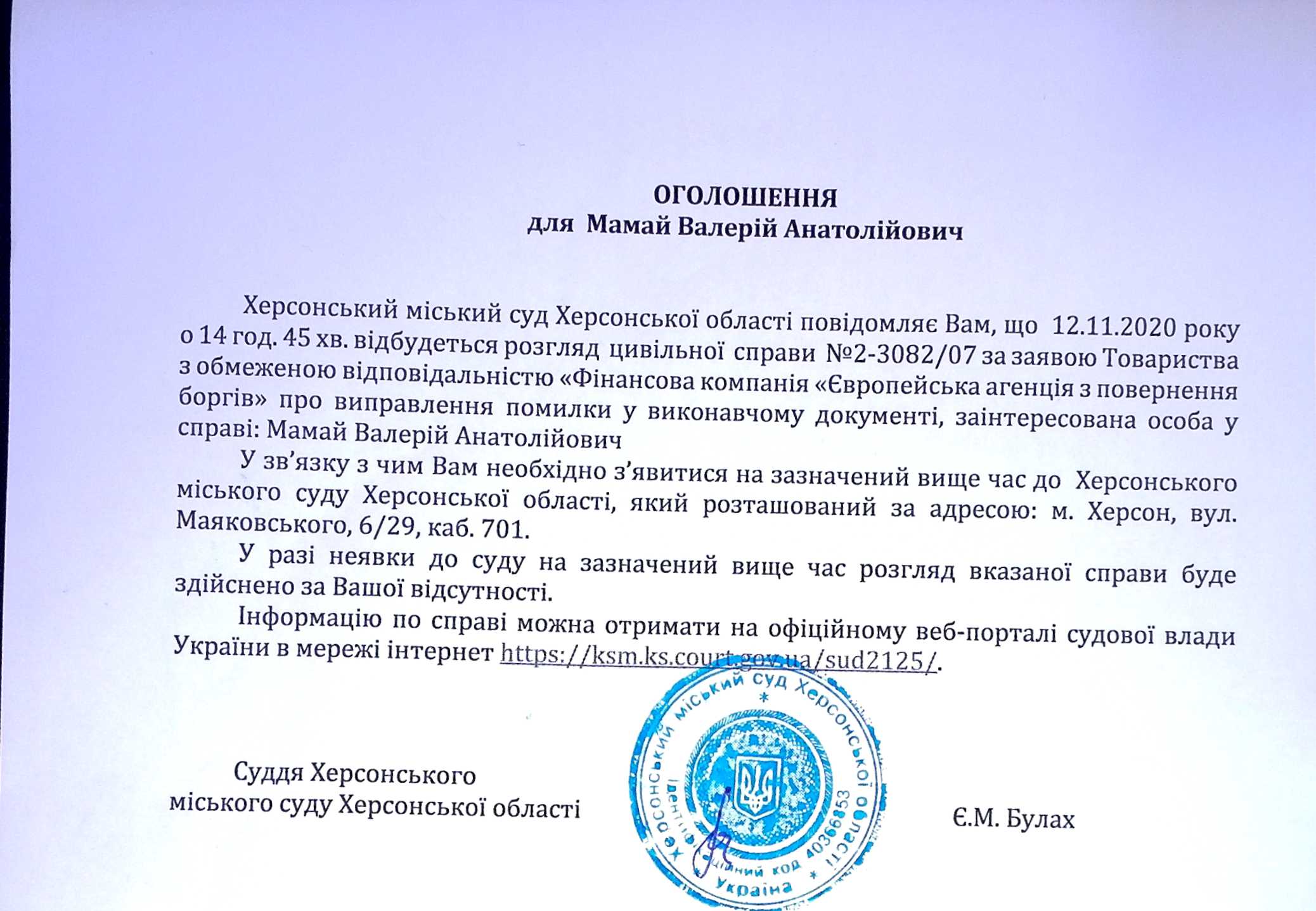 ОГОЛОШЕННЯ для Мамай Валерія Анатолійовича