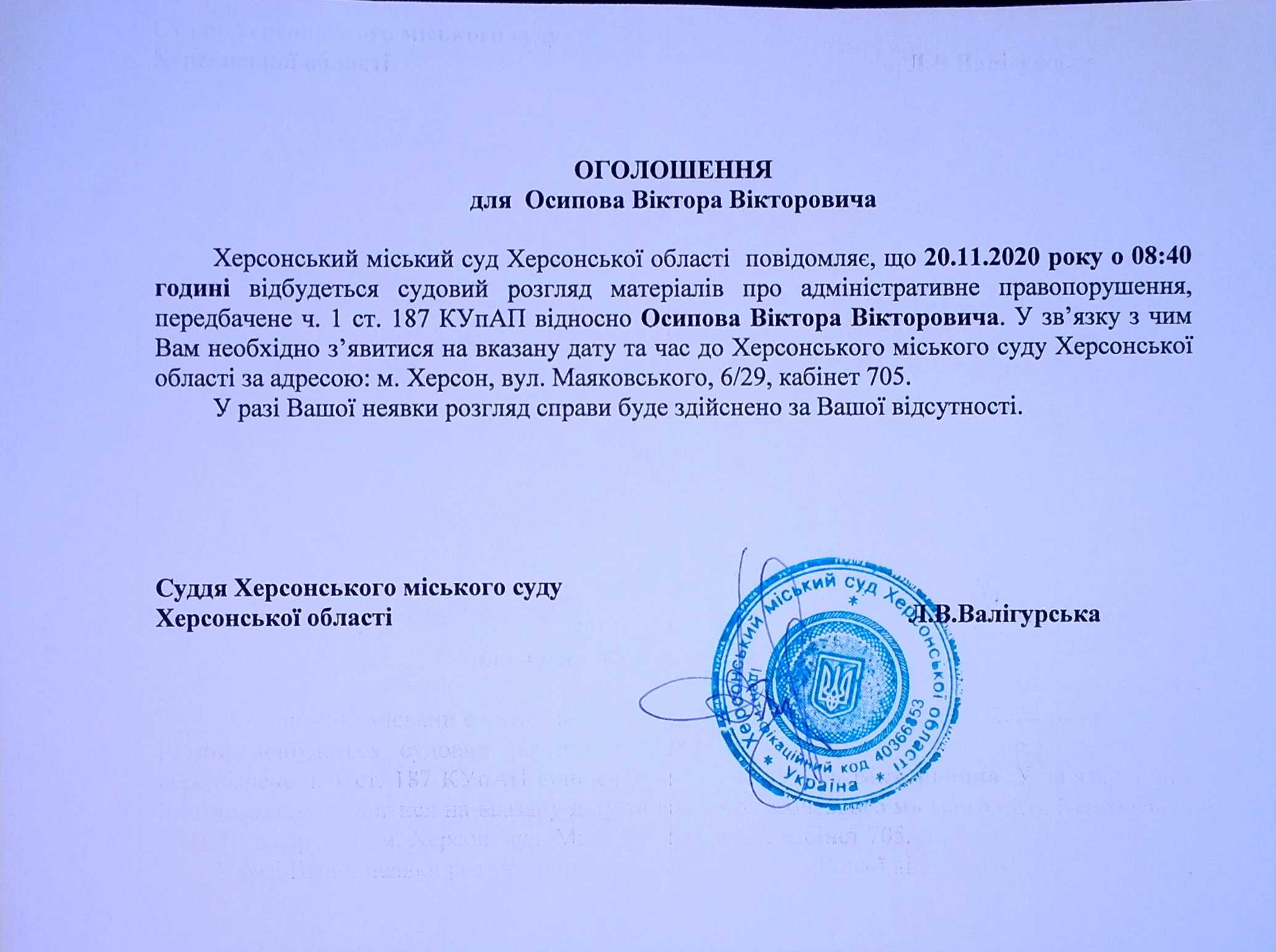 ОГОЛОШЕННЯ для Осипова Віктора Вікторовича