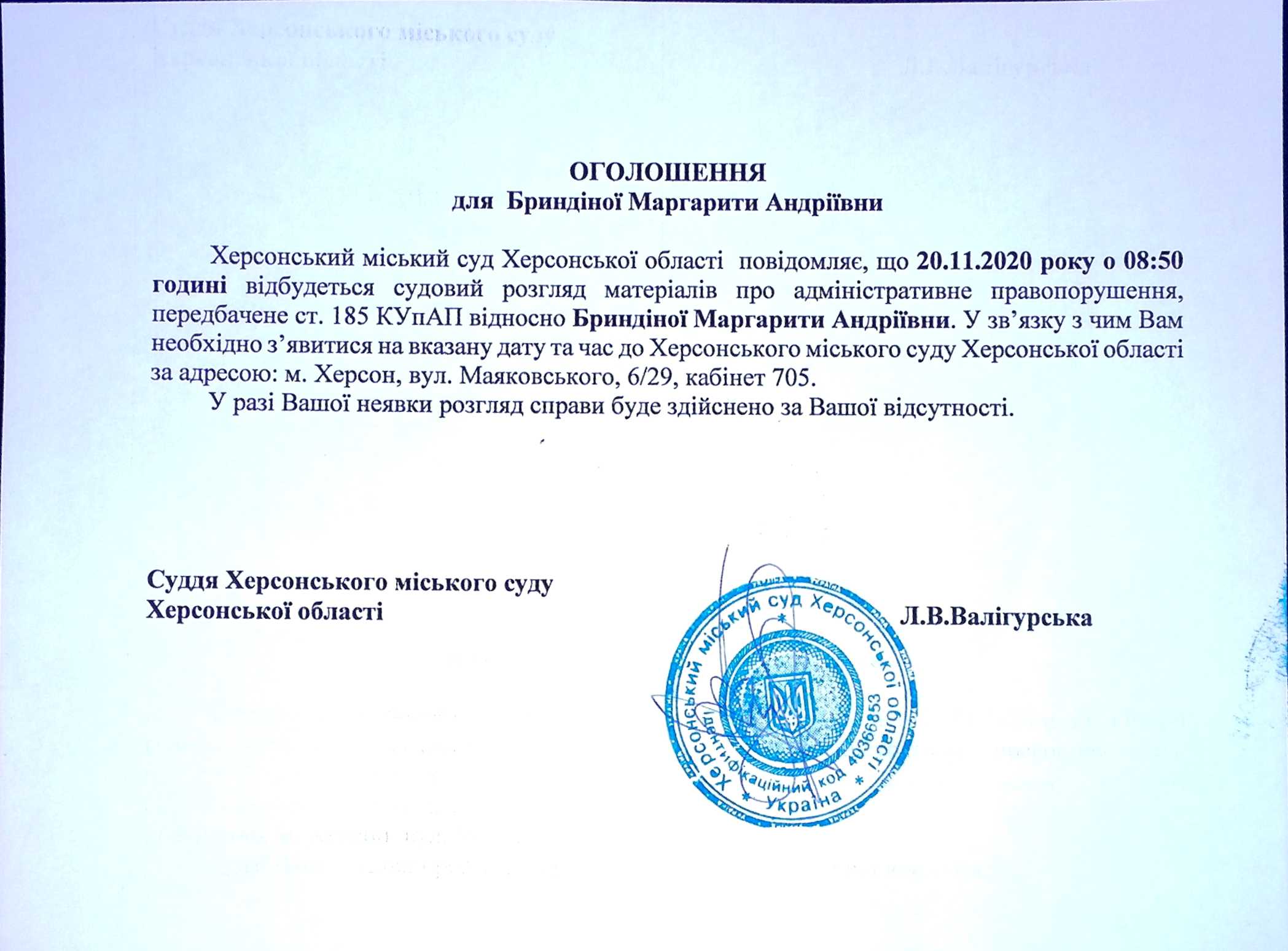 ОГОЛОШЕННЯ для Бриндіної Маргарити Андріївни