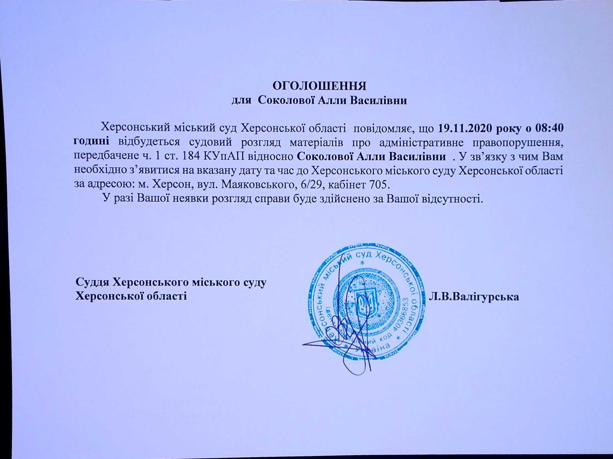 ОГОЛОШЕННЯ для Соколової Алли Василівни