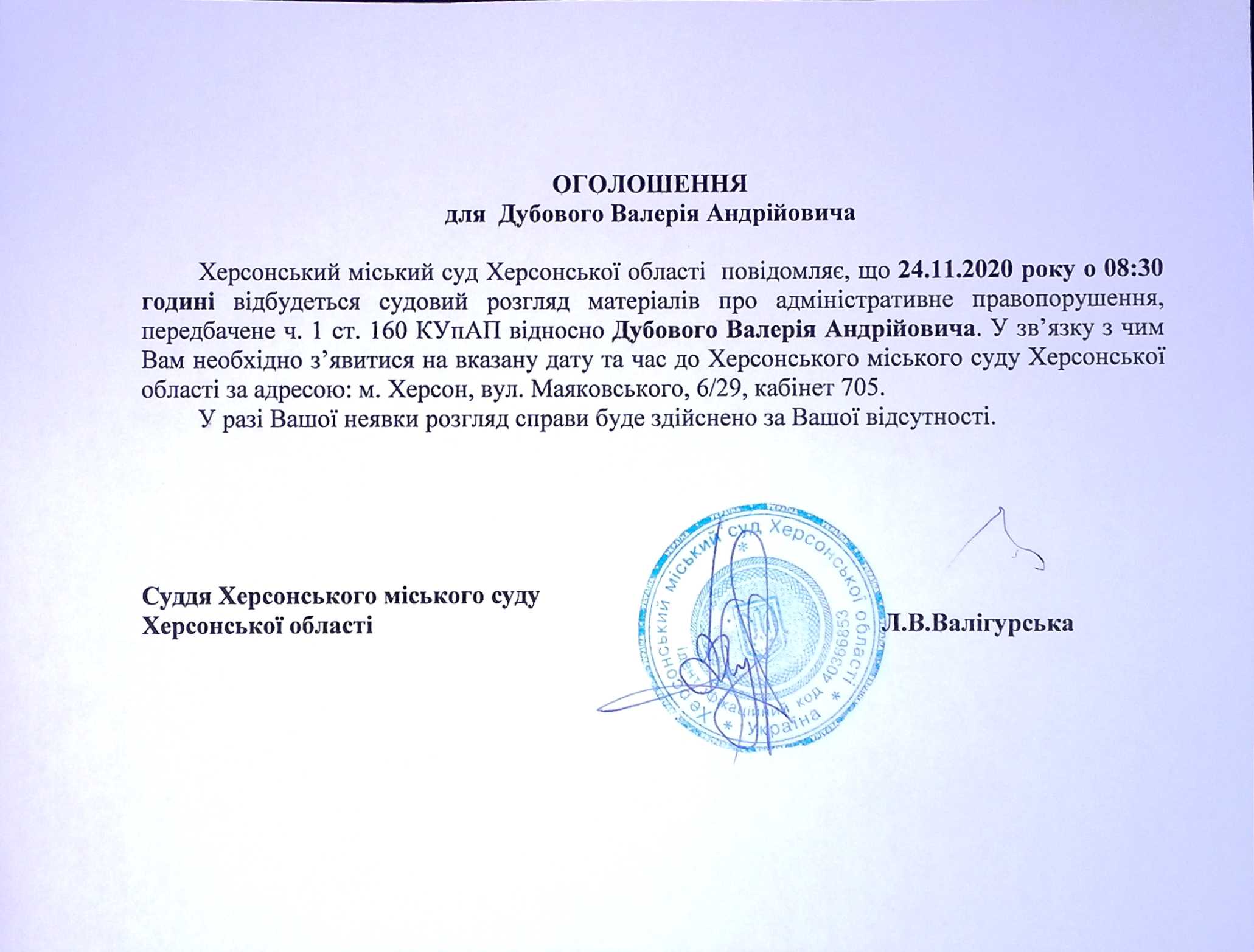 ОГОЛОШЕННЯ для Дубового Валерія Андрійовича
