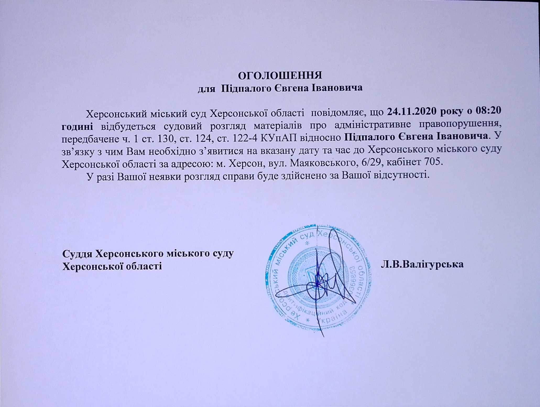 ОГОЛОШЕННЯ для Підпалого Євгена Івановича
