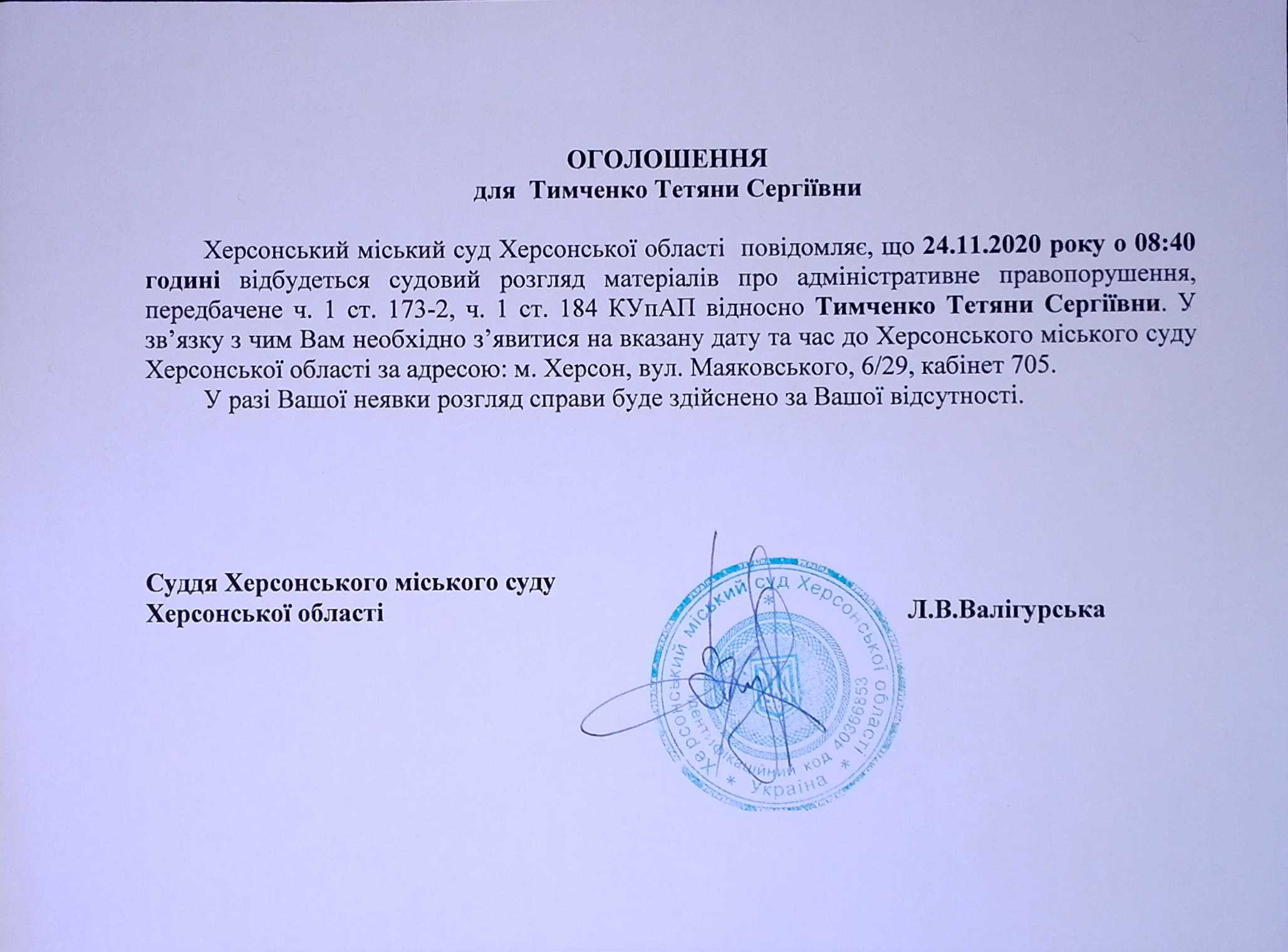 ОГОЛОШЕННЯ для Тимченко Тетяни Сергіївни