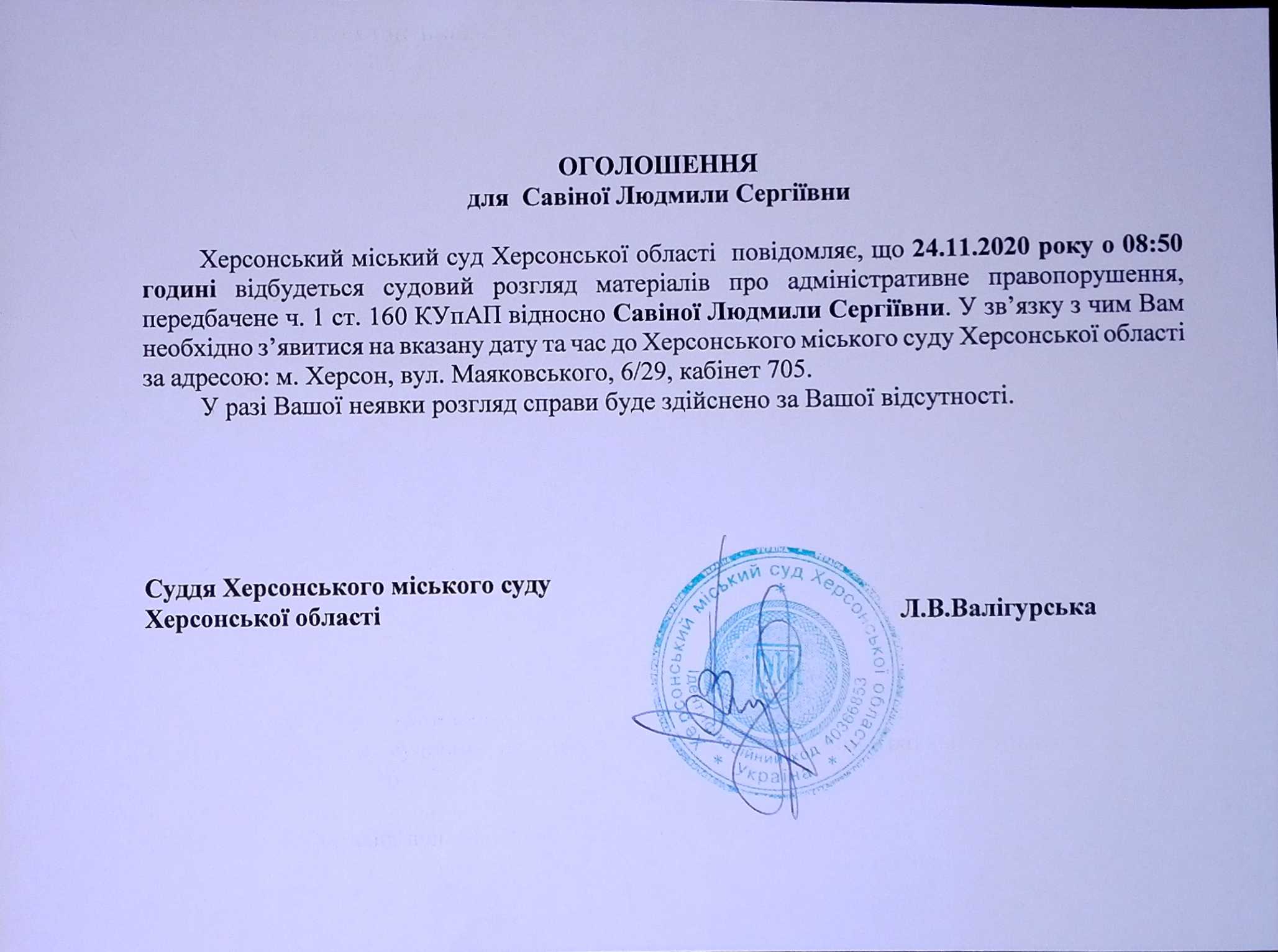 ОГОЛОШЕННЯ для Савіної Людмили Сергіївни