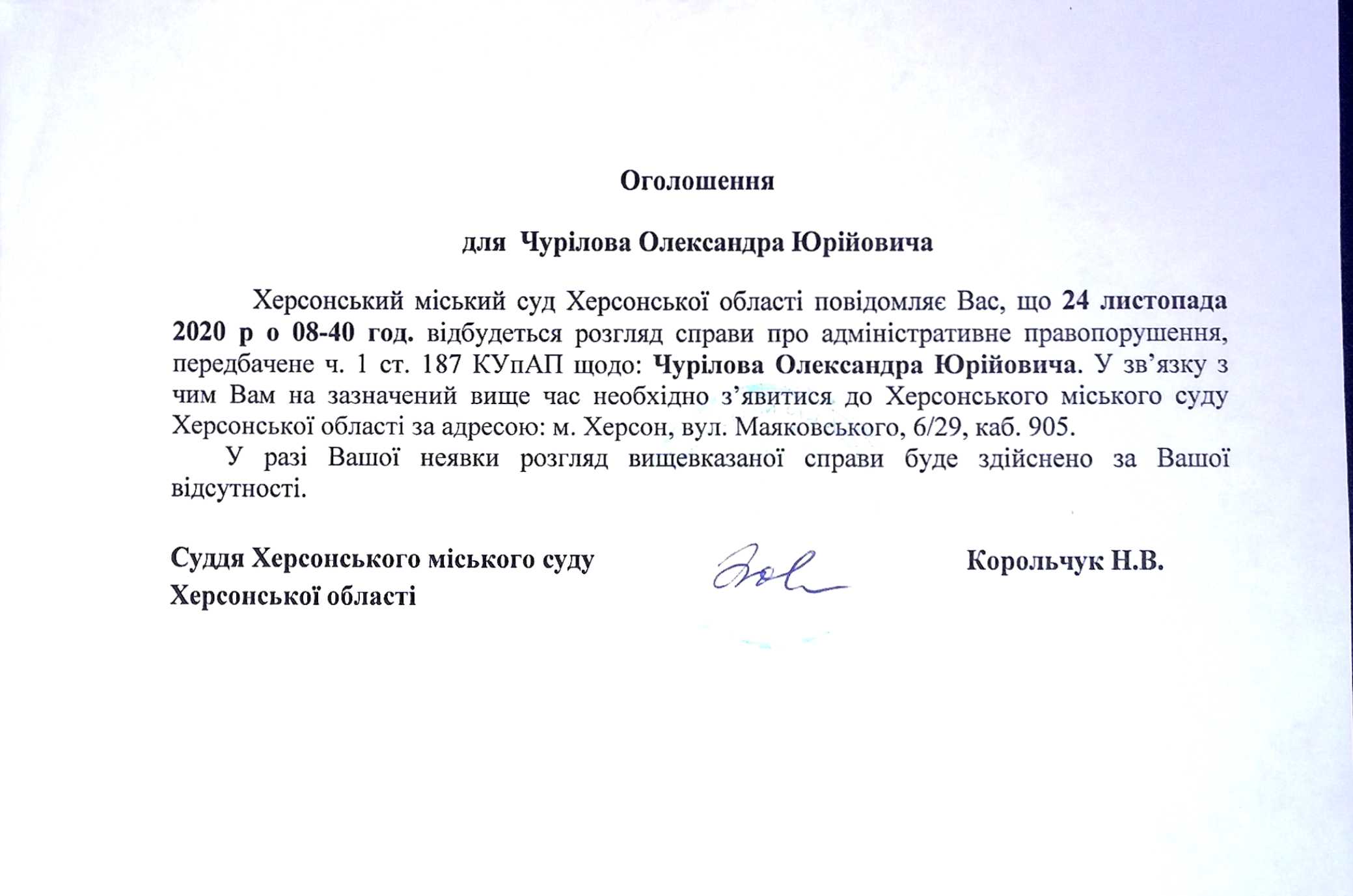 ОГОЛОШЕННЯ ПРО ВИКЛИК ДО СУДУ