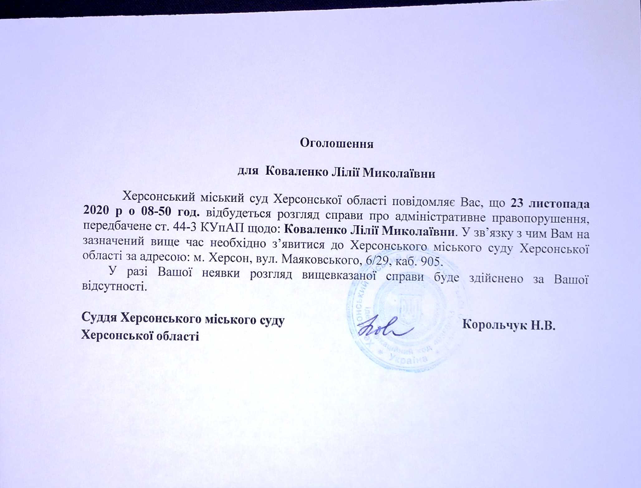 ОГОЛОШЕННЯ для Коваленко Лілії Миколаївни