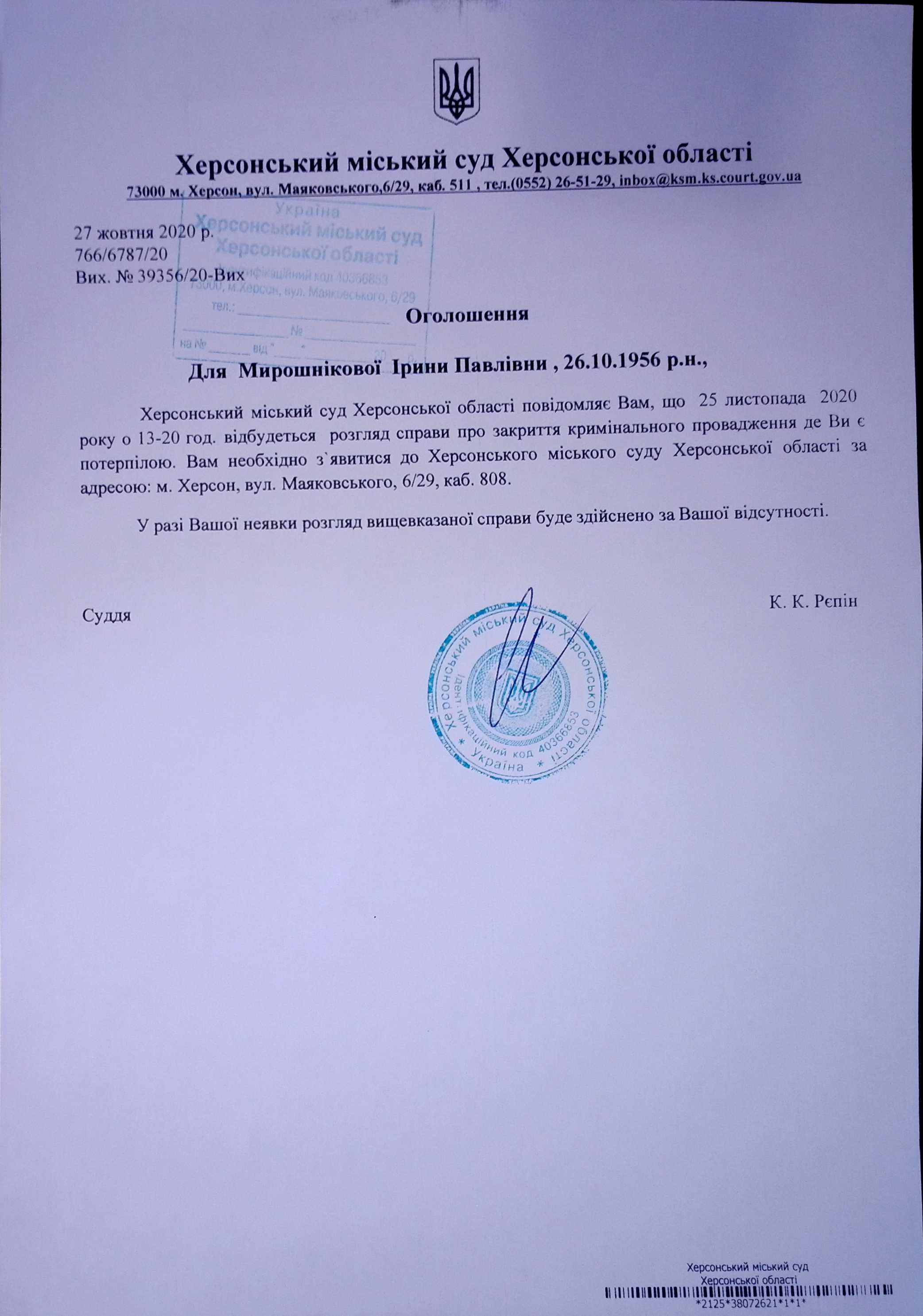 ОГОЛОШЕННЯ для Мирошнікової Ірини Павлівни