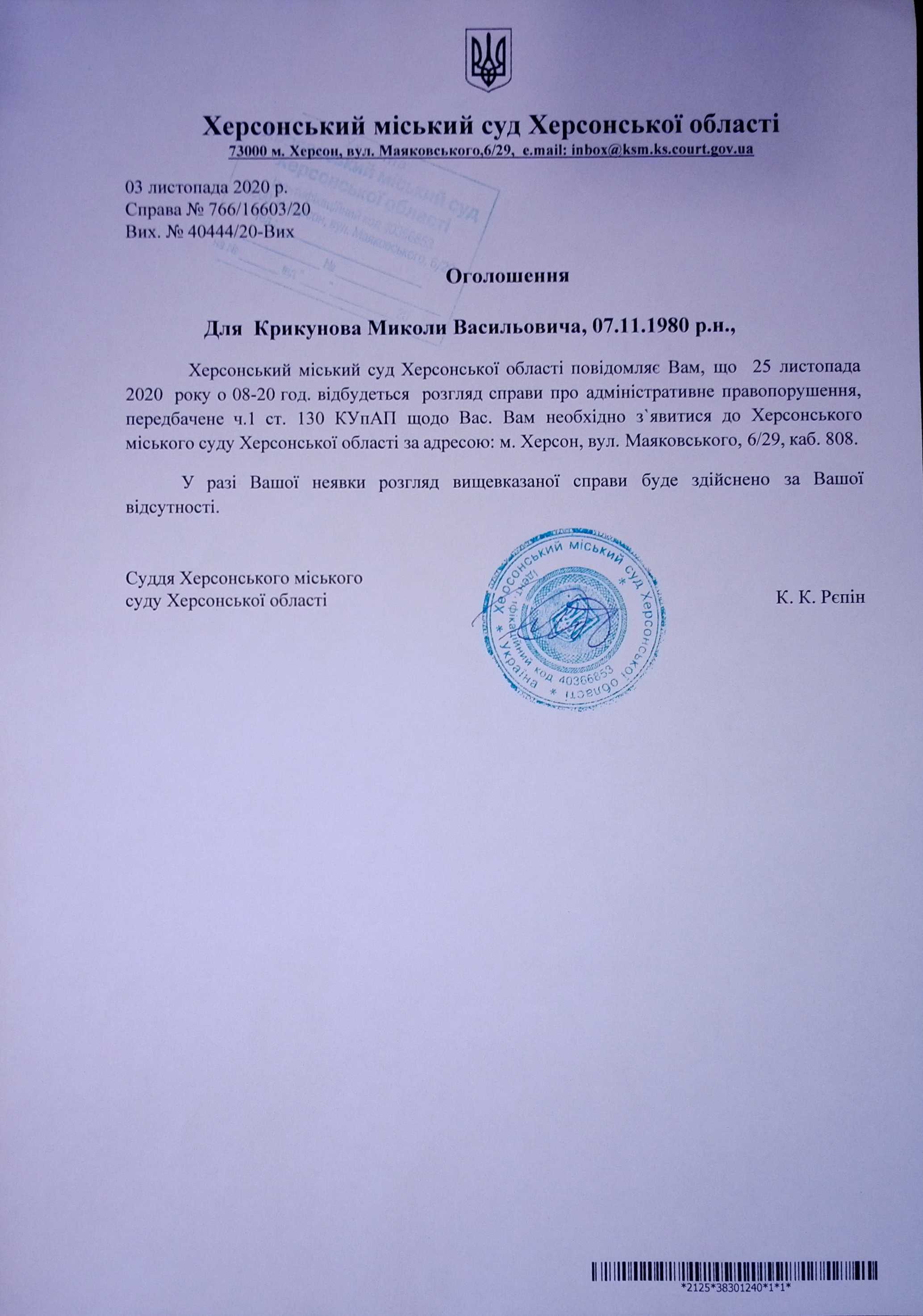 ОГОЛОШЕННЯ для Крикунова Миколи Васильовича