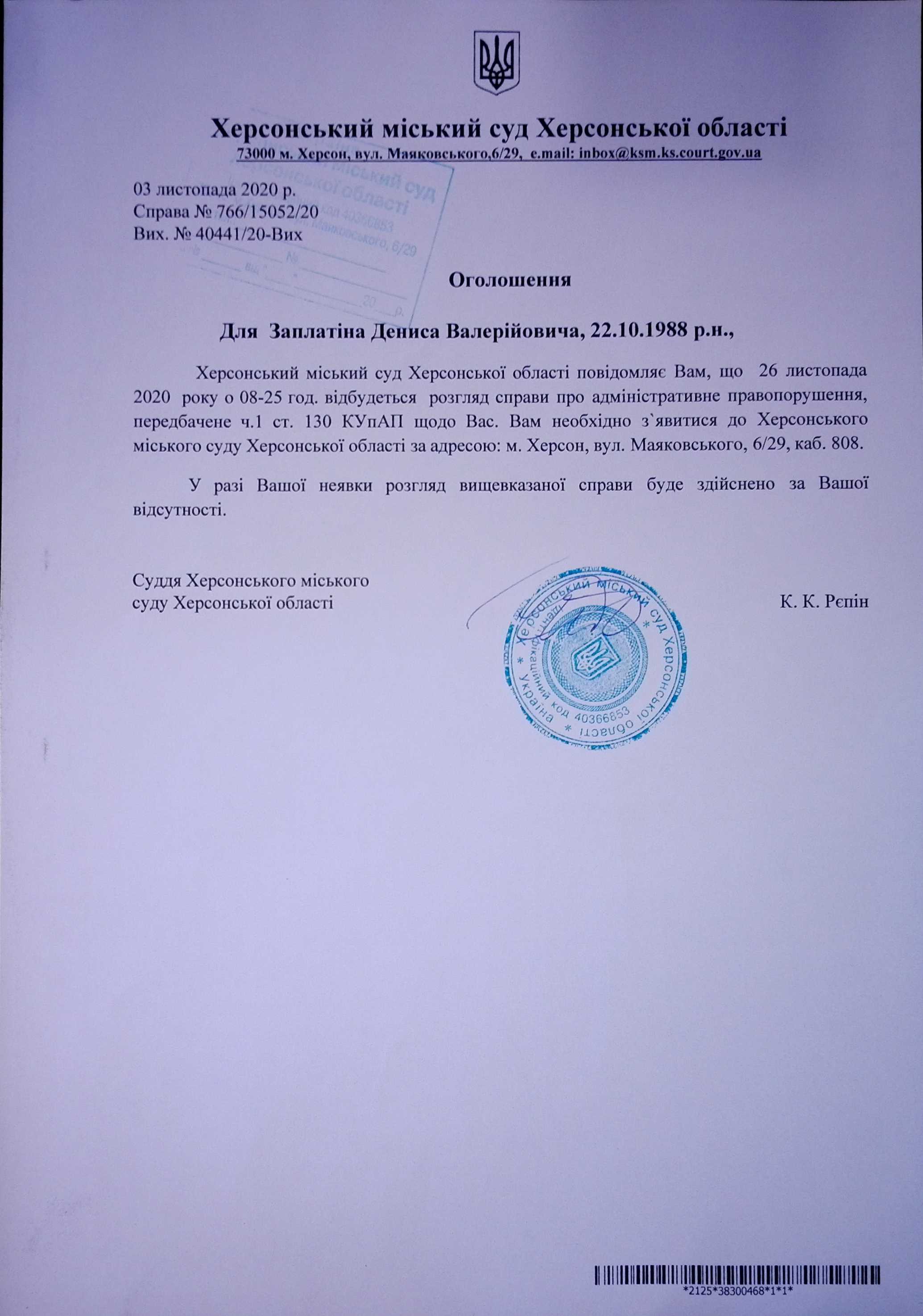 ОГОЛОШЕННЯ ПРО ВИКЛИК ДО СУДУ