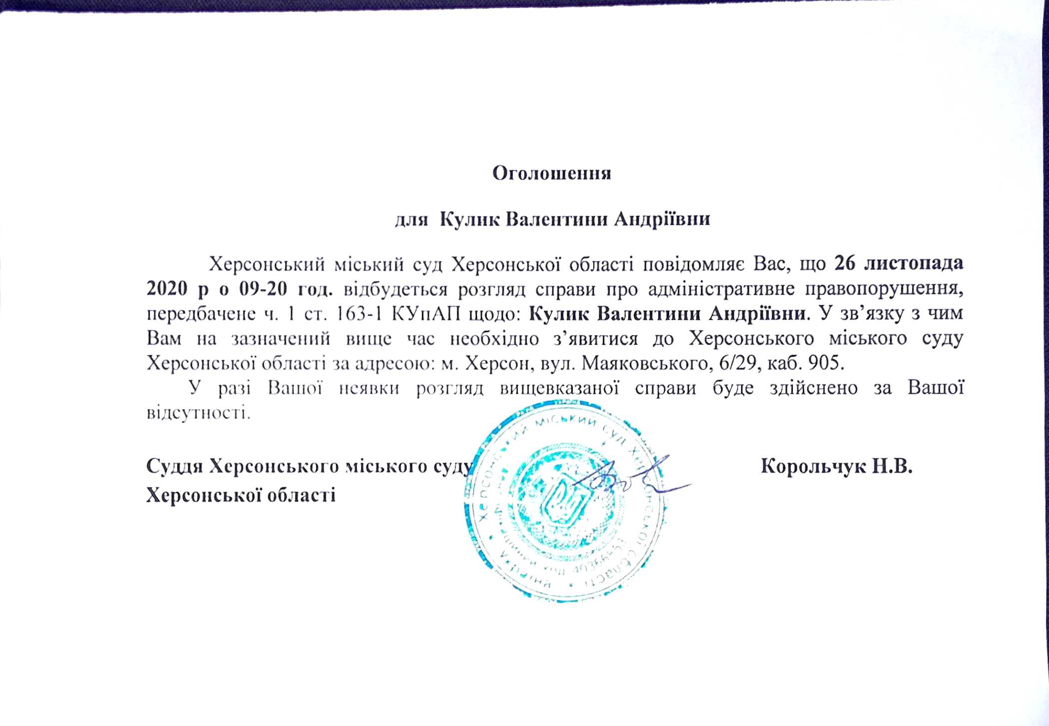 ОГОЛОШЕННЯ для Кулик Валентини Андріївни
