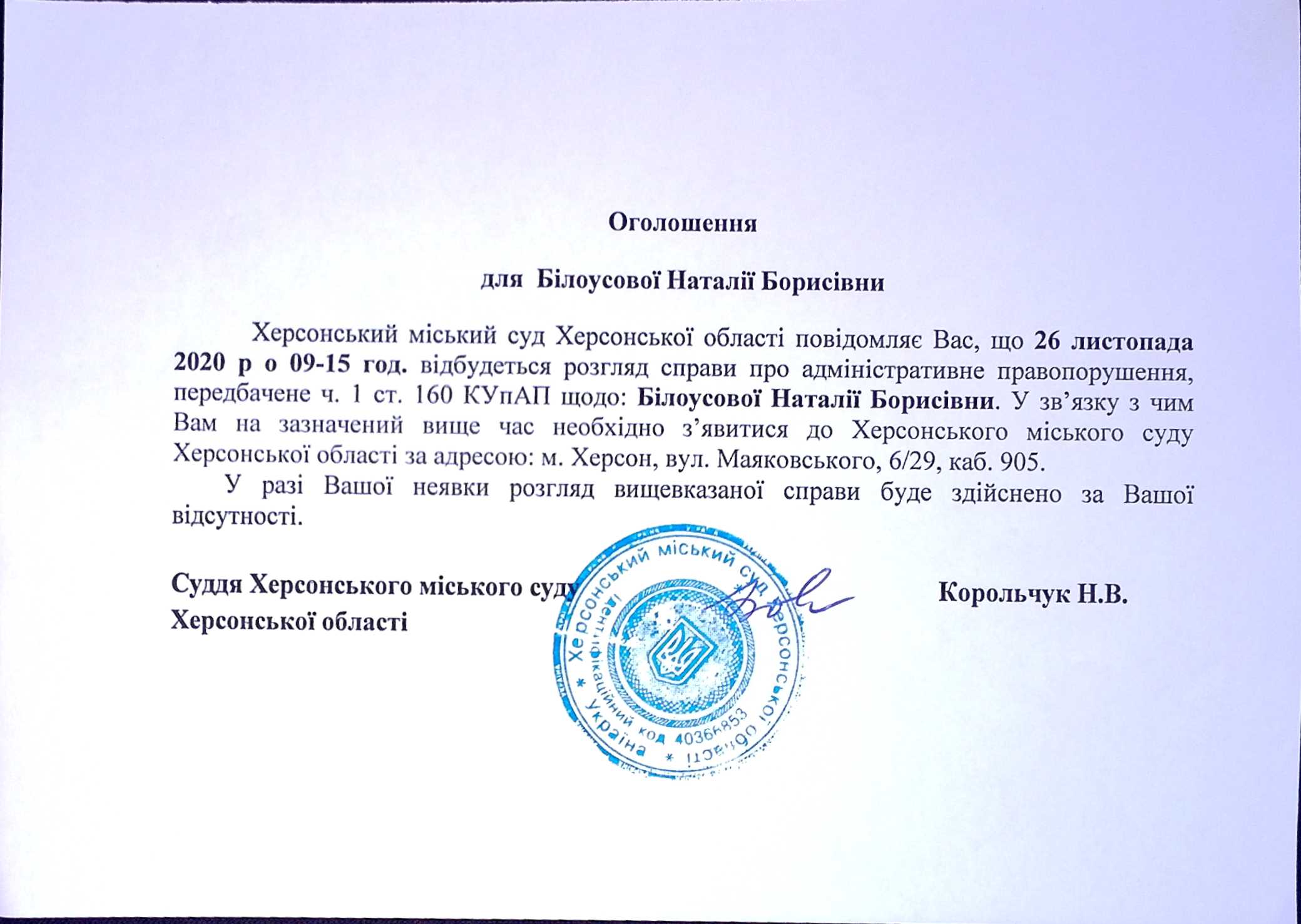 ОГОЛОШЕННЯ для Білоусової Наталії Борисівни