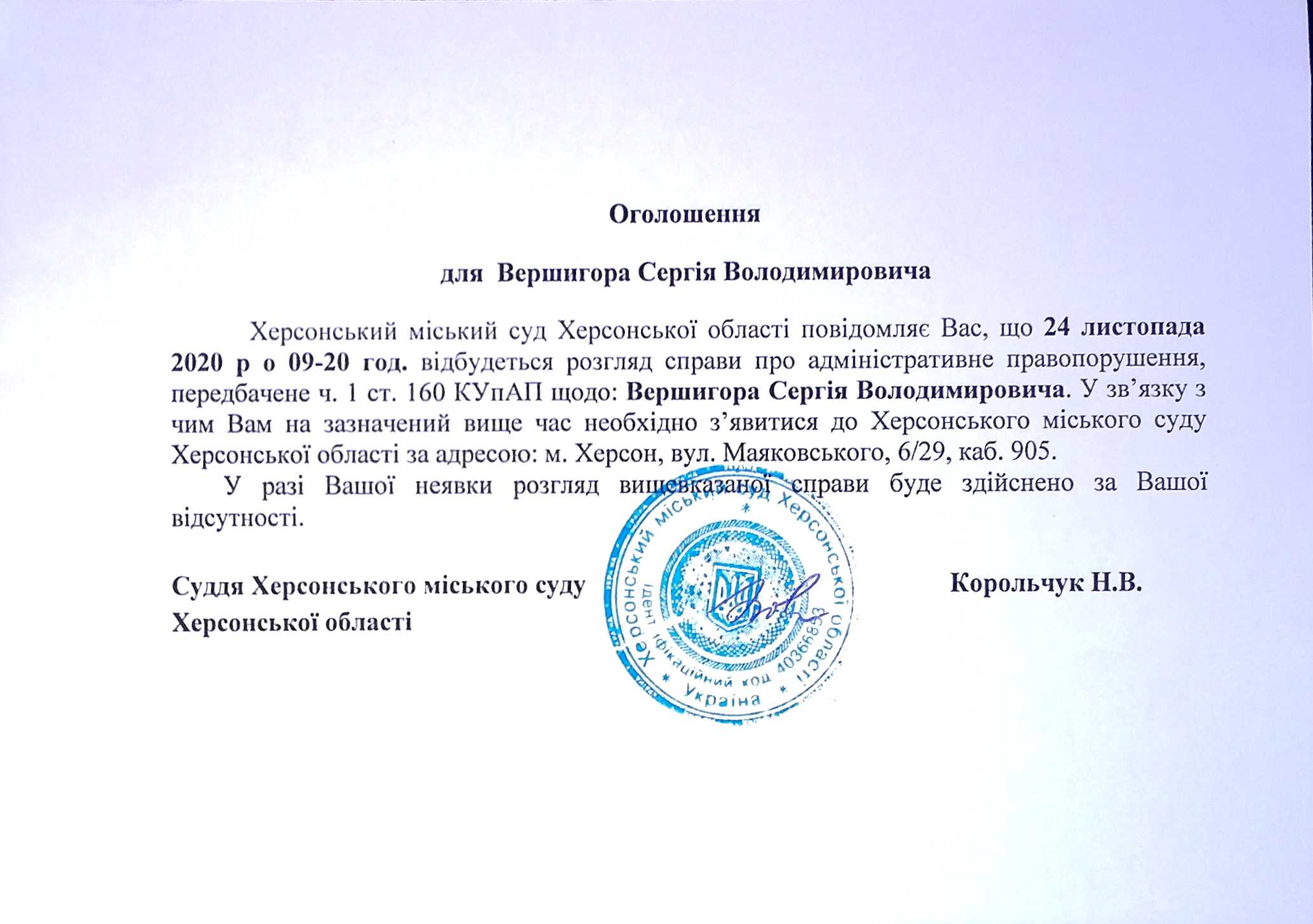 ОГОЛОШЕННЯ для Вершигора Сергія Володимировича