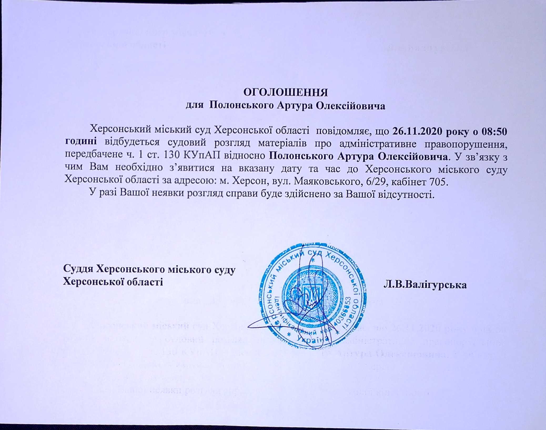 ОГОЛОШЕННЯ для Полонського Артура Олексійовича