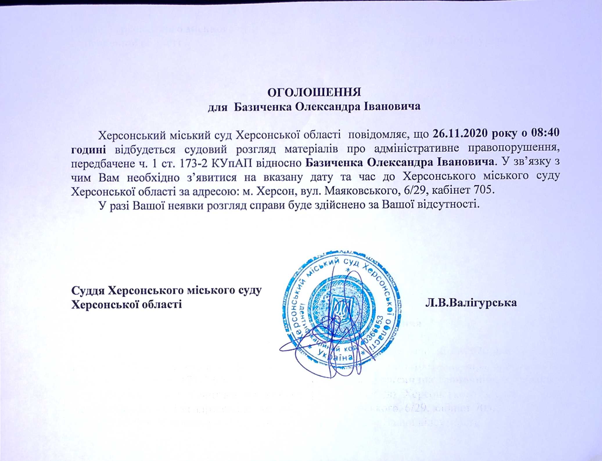 ОГОЛОШЕННЯ ПРО ВИКЛИК ДО СУДУ