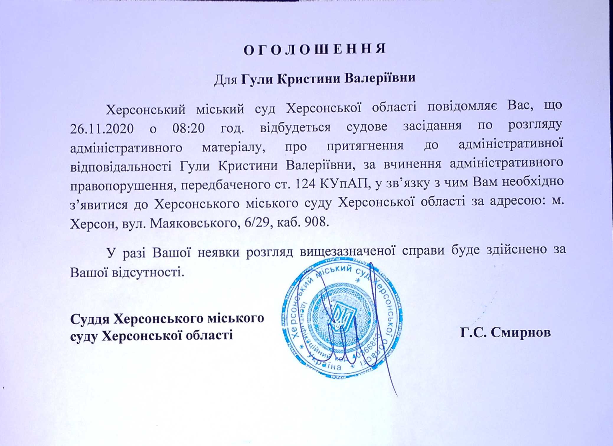 ОГОЛОШЕННЯ для Гули Кристини Валеріївни