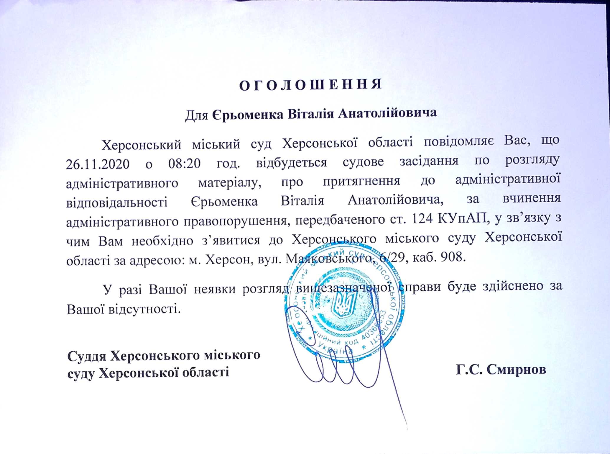 ОГОЛОШЕННЯ ПРО ВИКЛИК ДО СУДУ