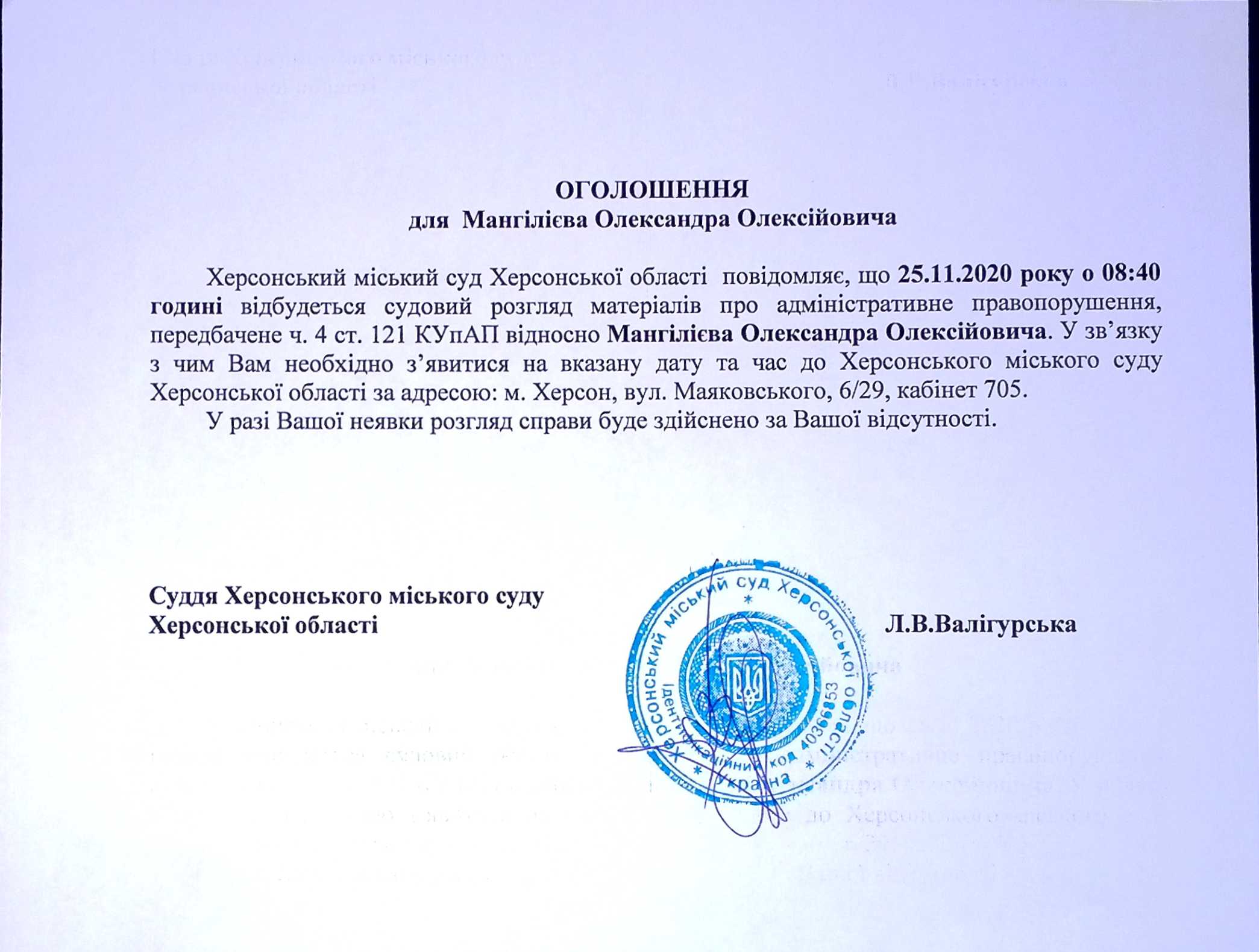 ОГОЛОШЕННЯ для Мангілієва Олександра Олексійовича
