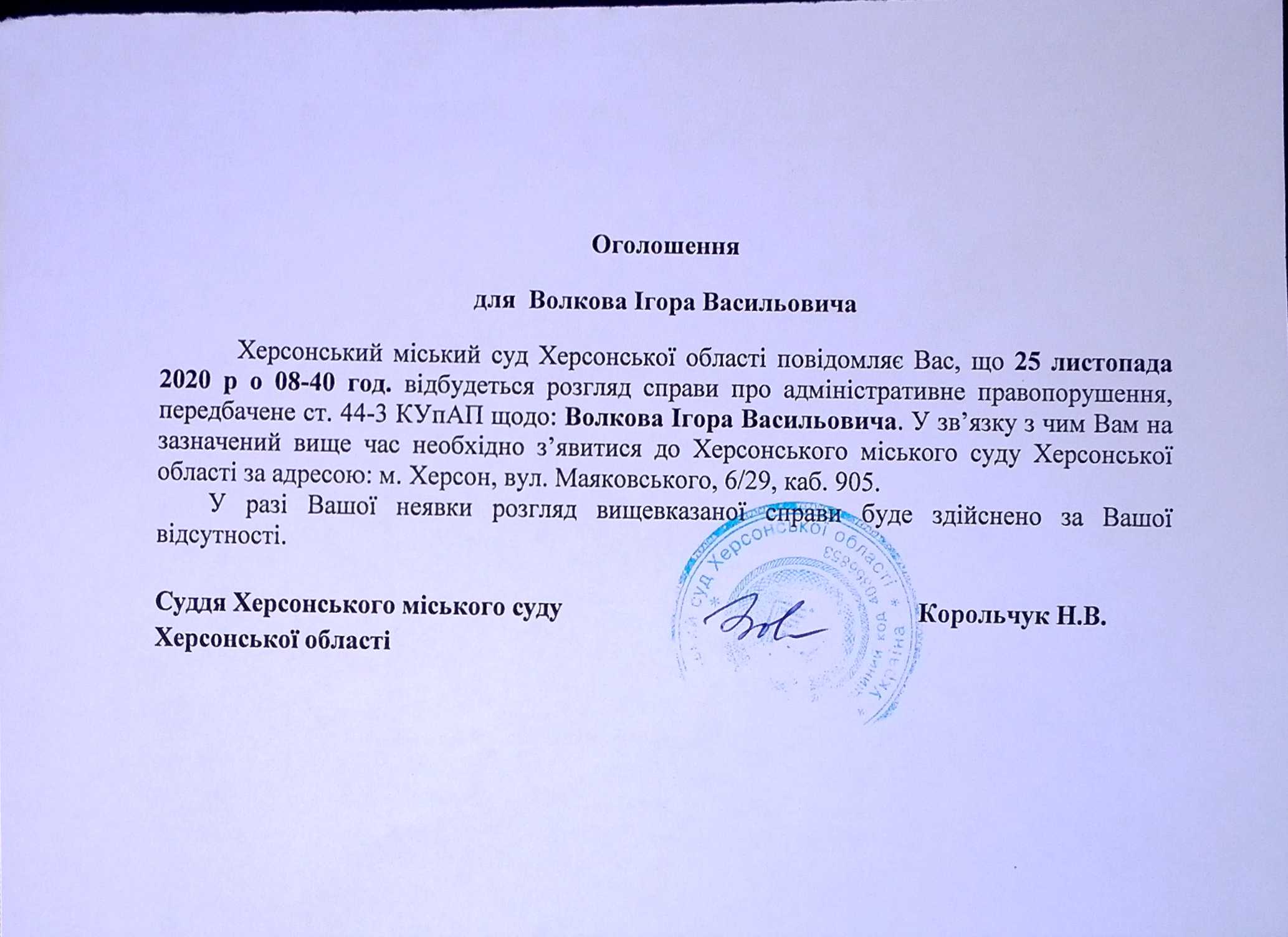 ОГОЛОШЕННЯ для Волкова Ігоря Васильовича