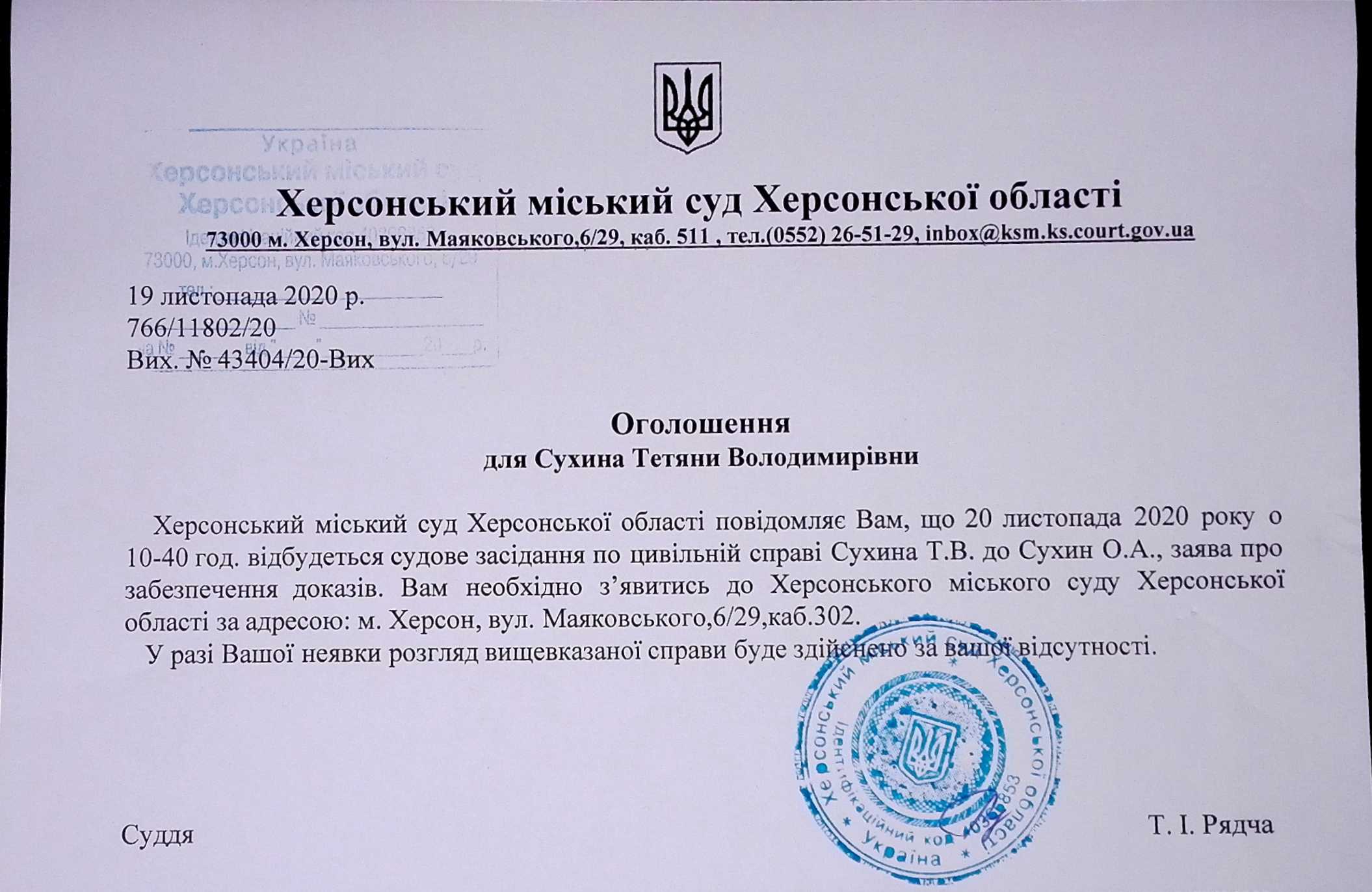 ОГОЛОШЕННЯ для Сухина Тетяна Володимирівни