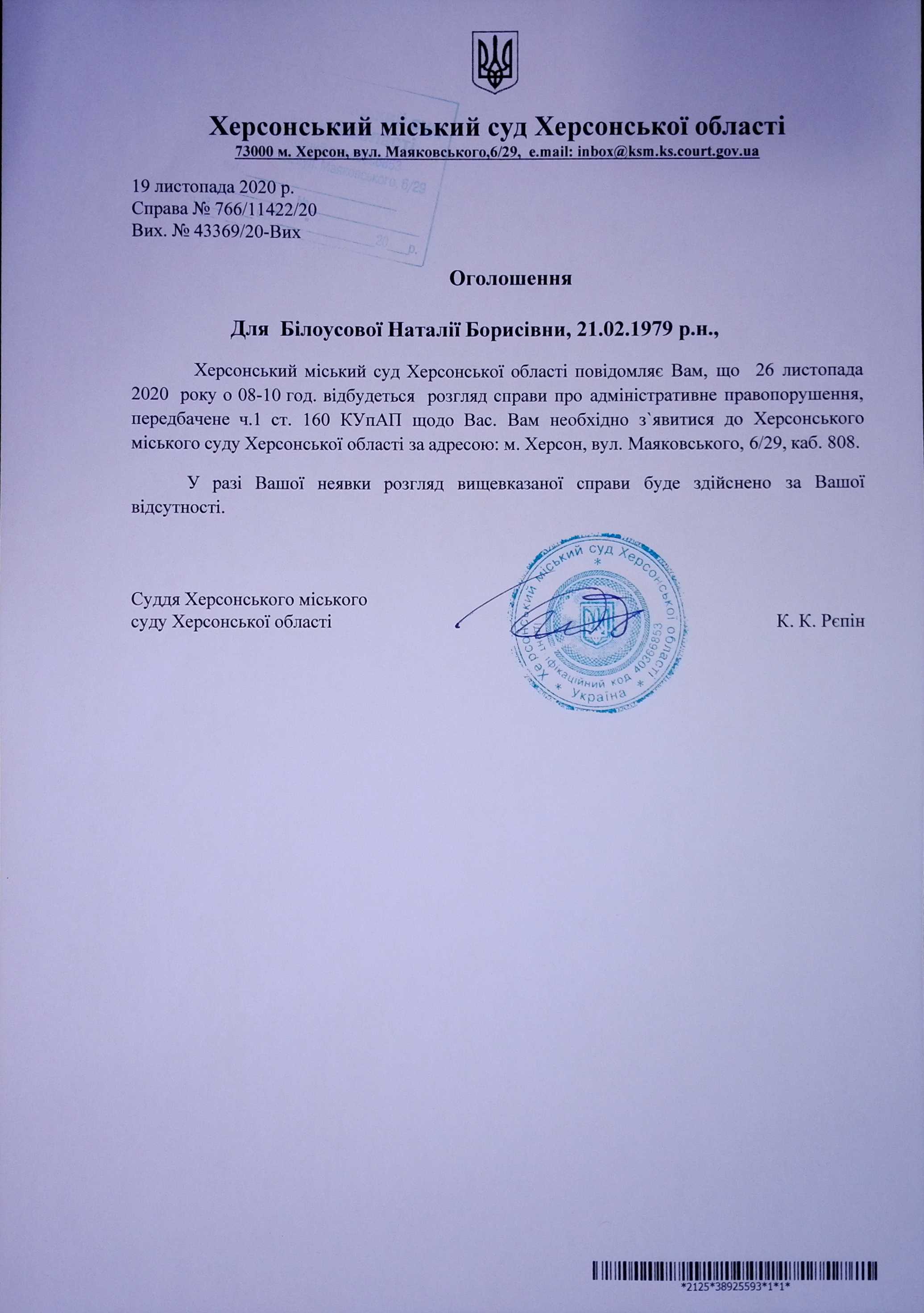 ОГОЛОШЕННЯ для Білоусової Наталії Борисівни