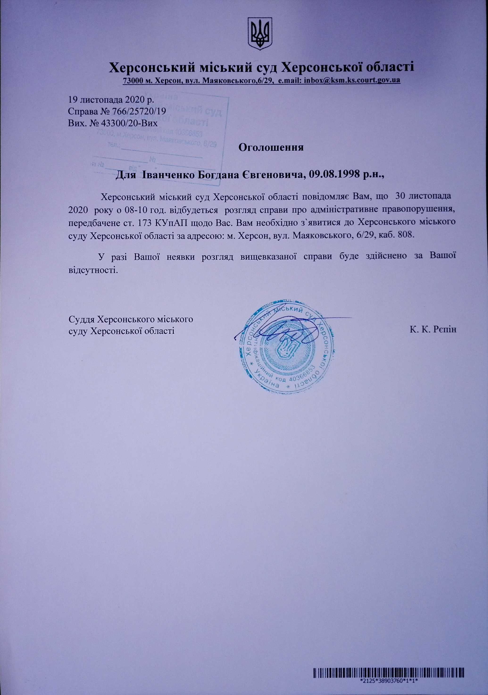 ОГОЛОШЕННЯ для Іванченко Богдана Євгеновича