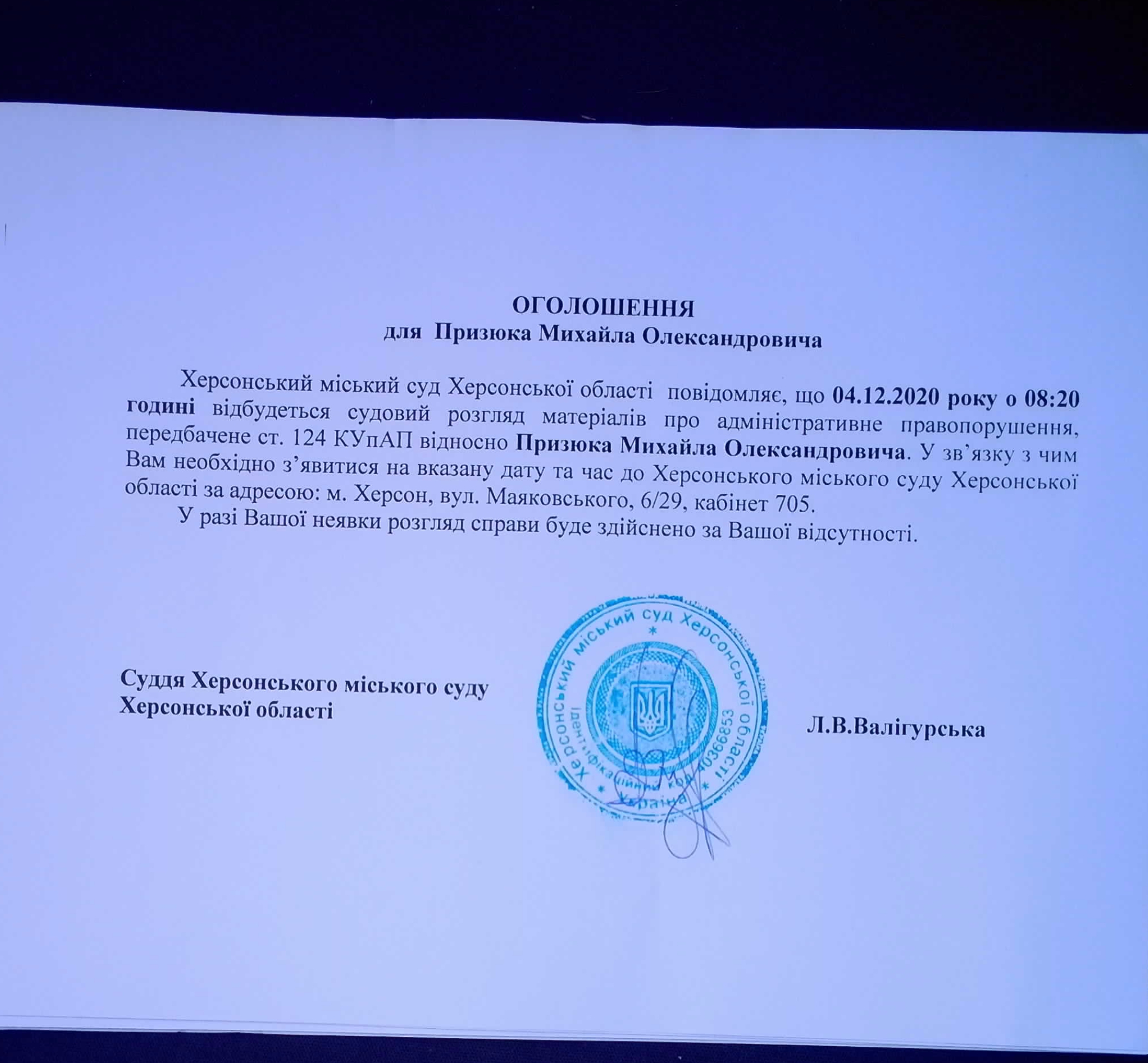 ОГОЛОШЕННЯ для Призюка Михайла Олександровича