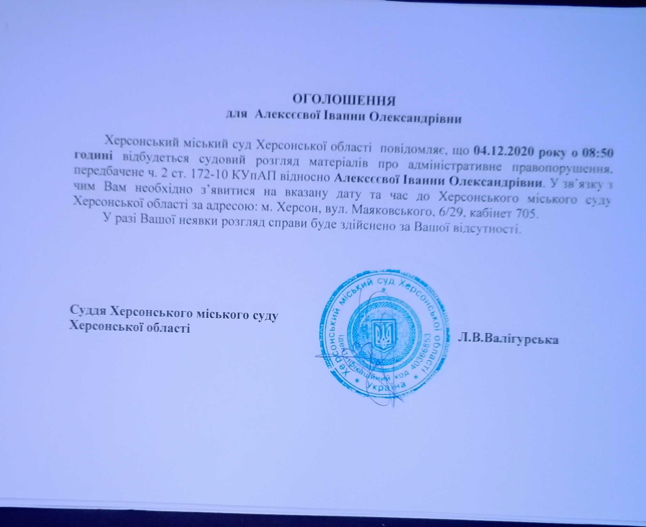ОГОЛОШЕННЯ для Алексєєвої Іванни Олександрівни