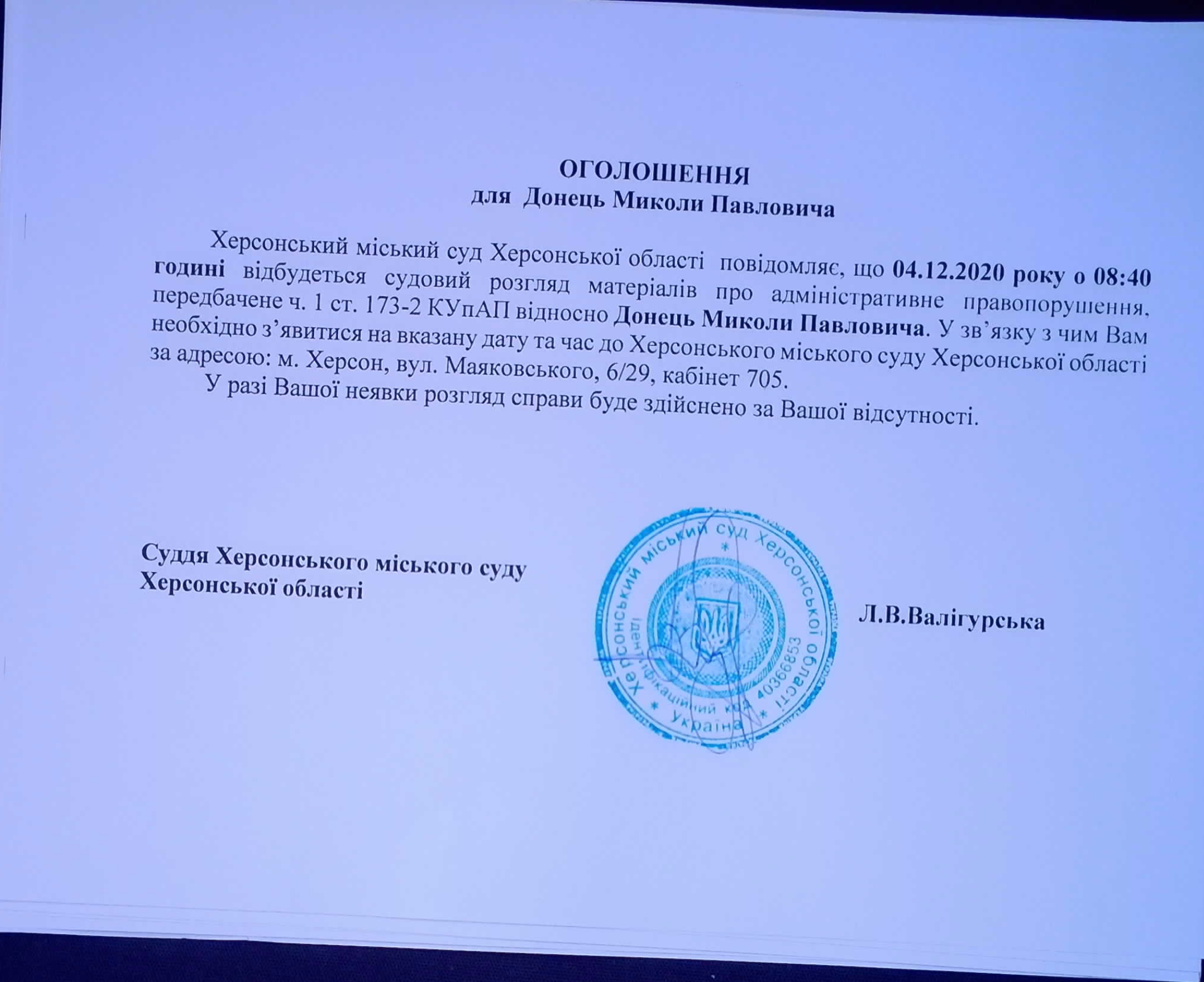 ОГОЛОШЕННЯ ПРО ВИКЛИК ДО СУДУ