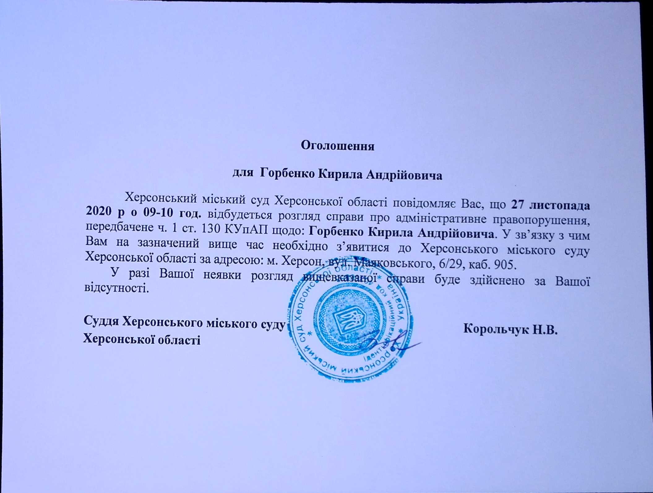 ОГОЛОШЕННЯ для Горбенко Кирила Андрійовича