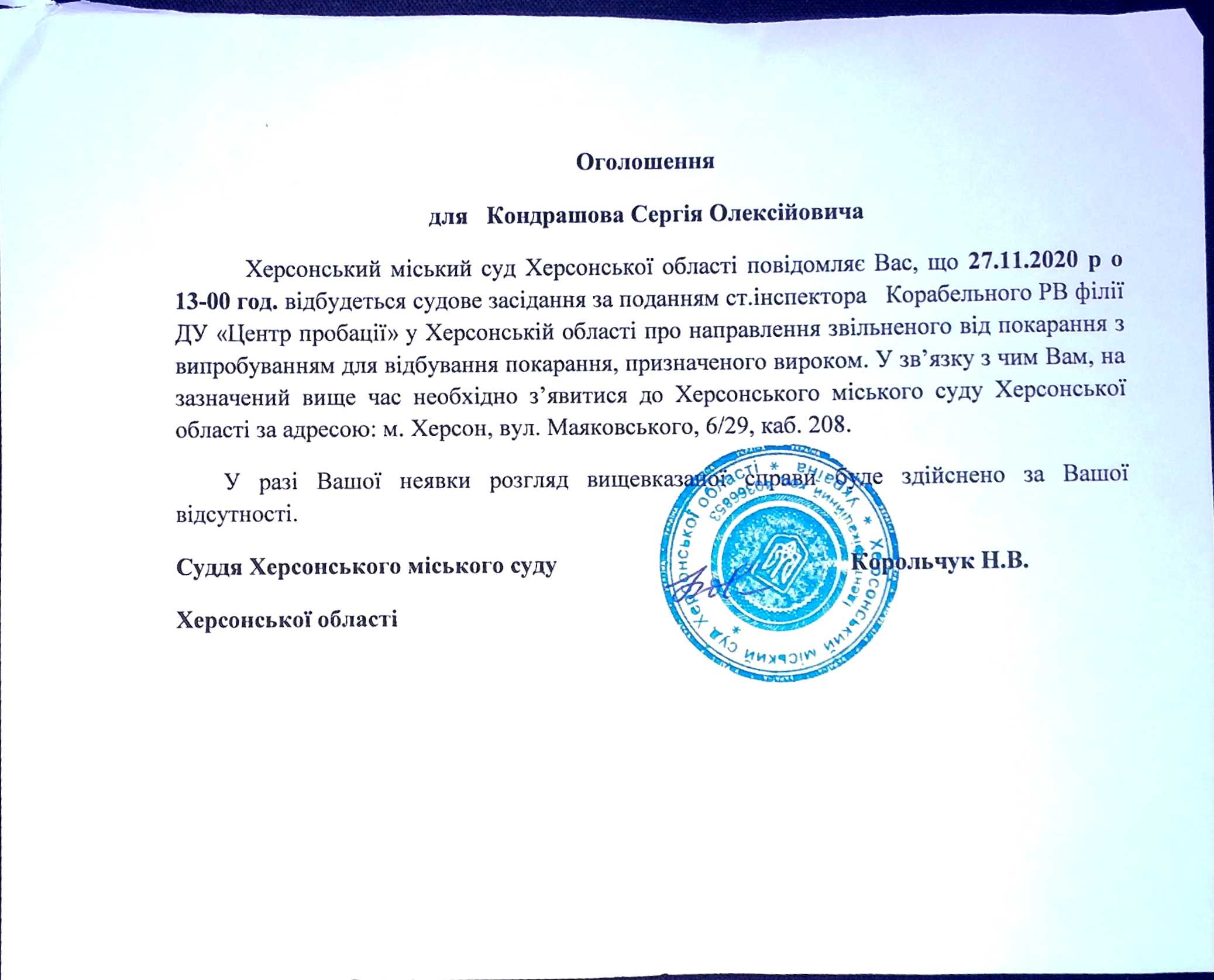 ОГОЛОШЕННЯ для Кондрашова Сергія Олексійовича