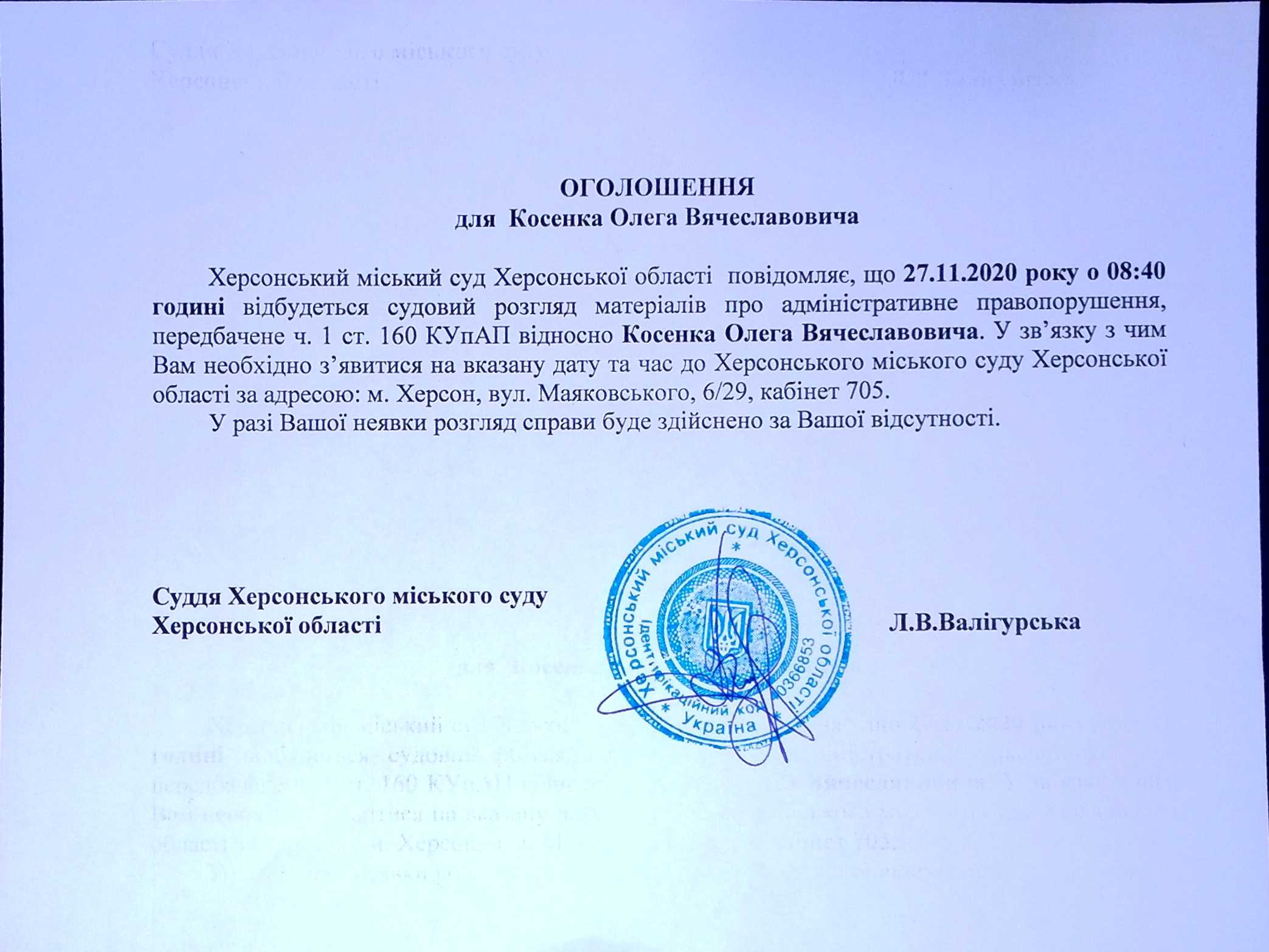 ОГОЛОШЕННЯ для Косенка Олега Вячеславовича