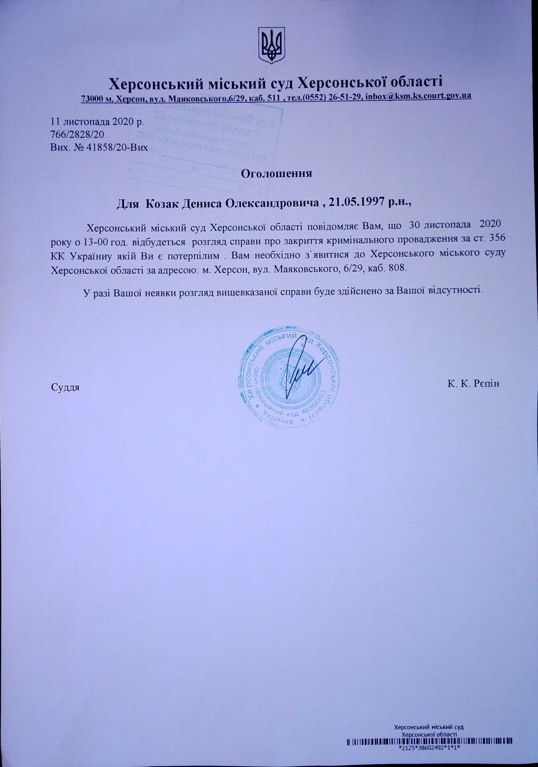 ОГОЛОШЕННЯ для Козак Дениса Олександровича