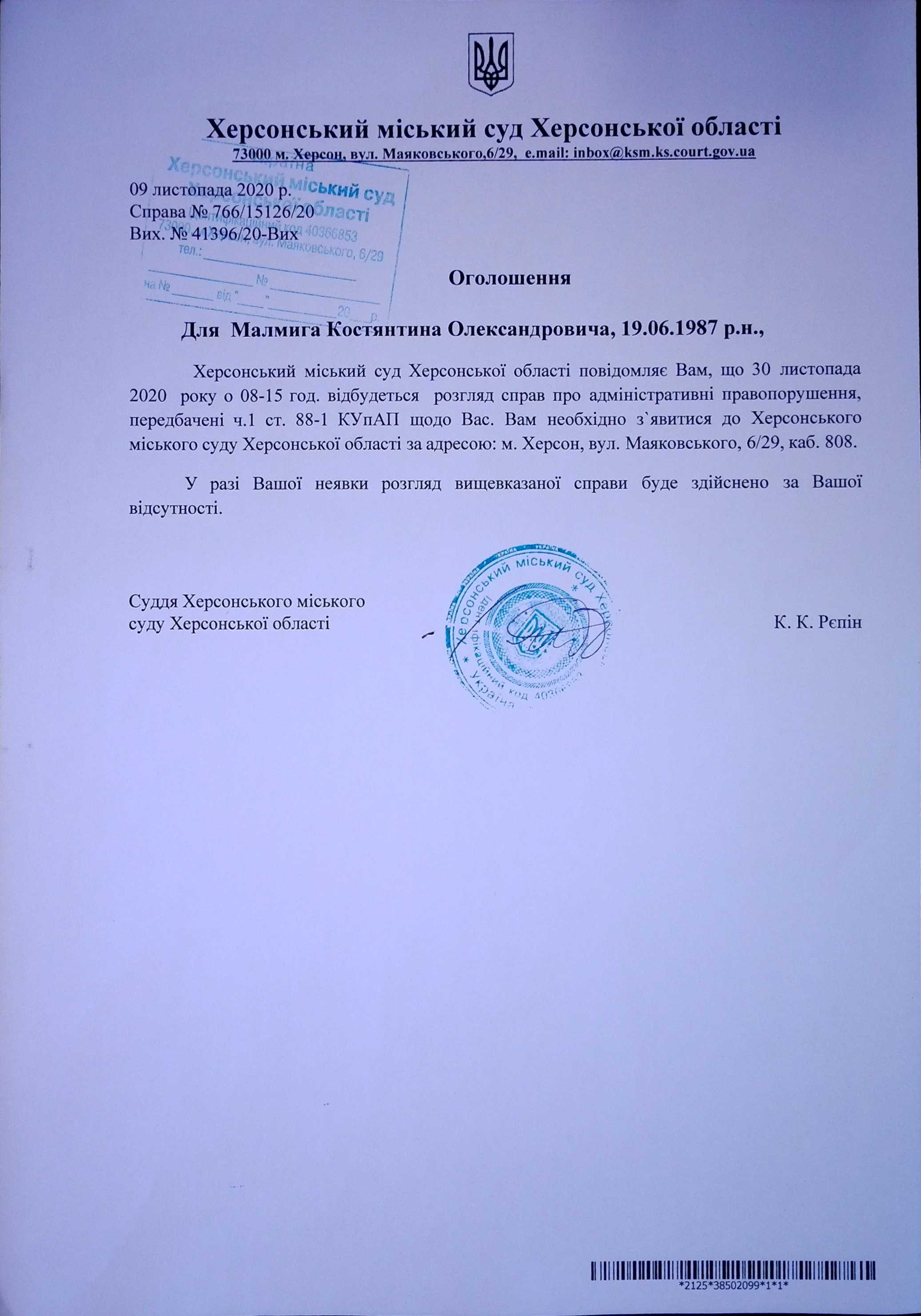 ОГОЛОШЕННЯ для Малмига Костянтина Олександровича