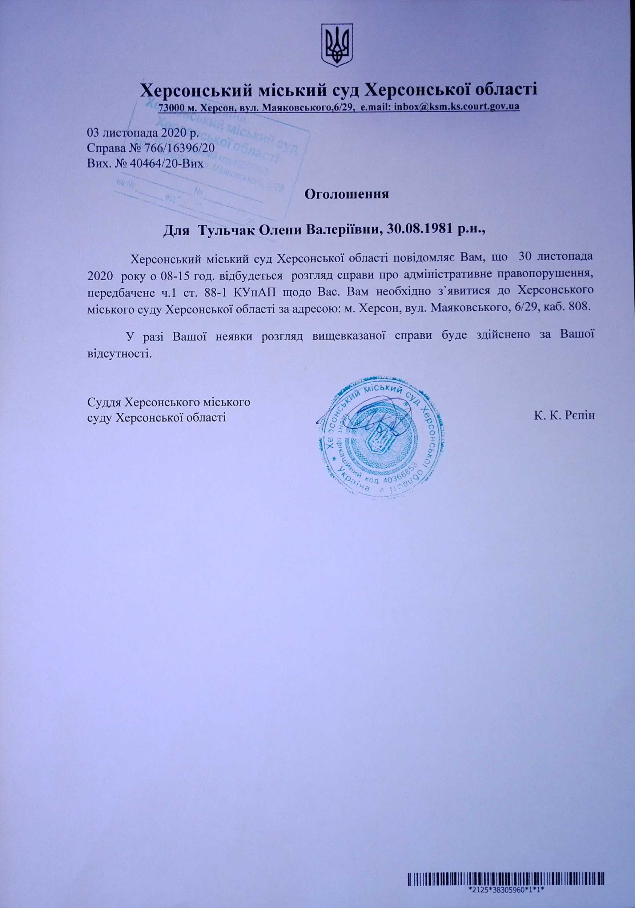 ОГОЛОШЕННЯ ПРО ВИКЛИК ДО СУДУ