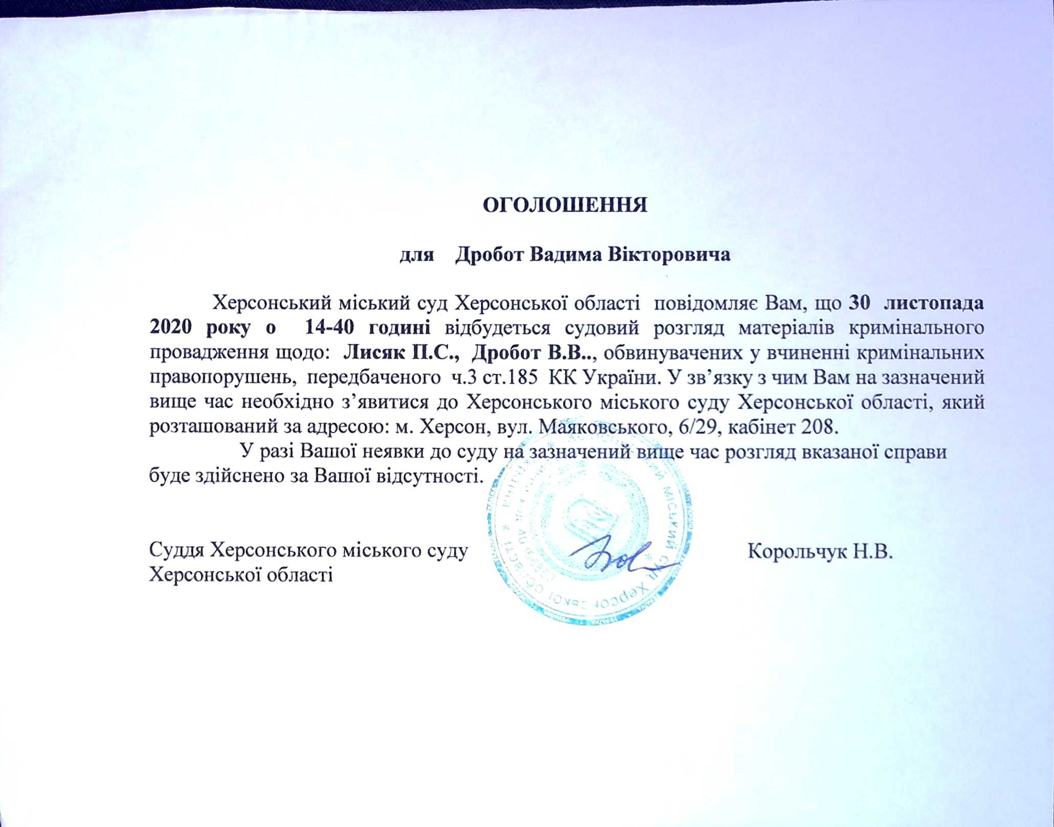 ОГОЛОШЕННЯ ПРО ВИКЛИК ДО СУДУ