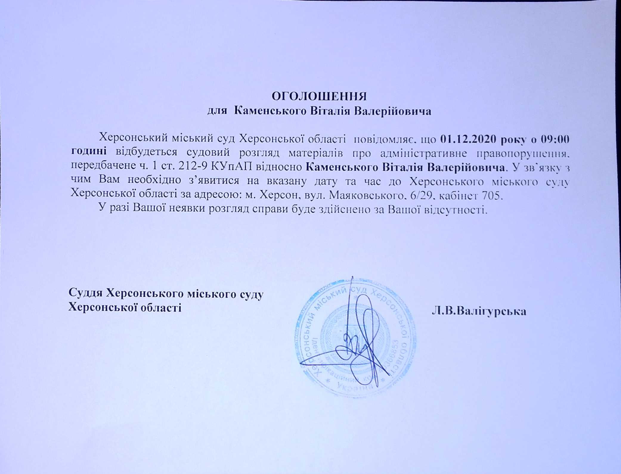 ОГОЛОШЕННЯ для Каменського Віталія Валерійовича