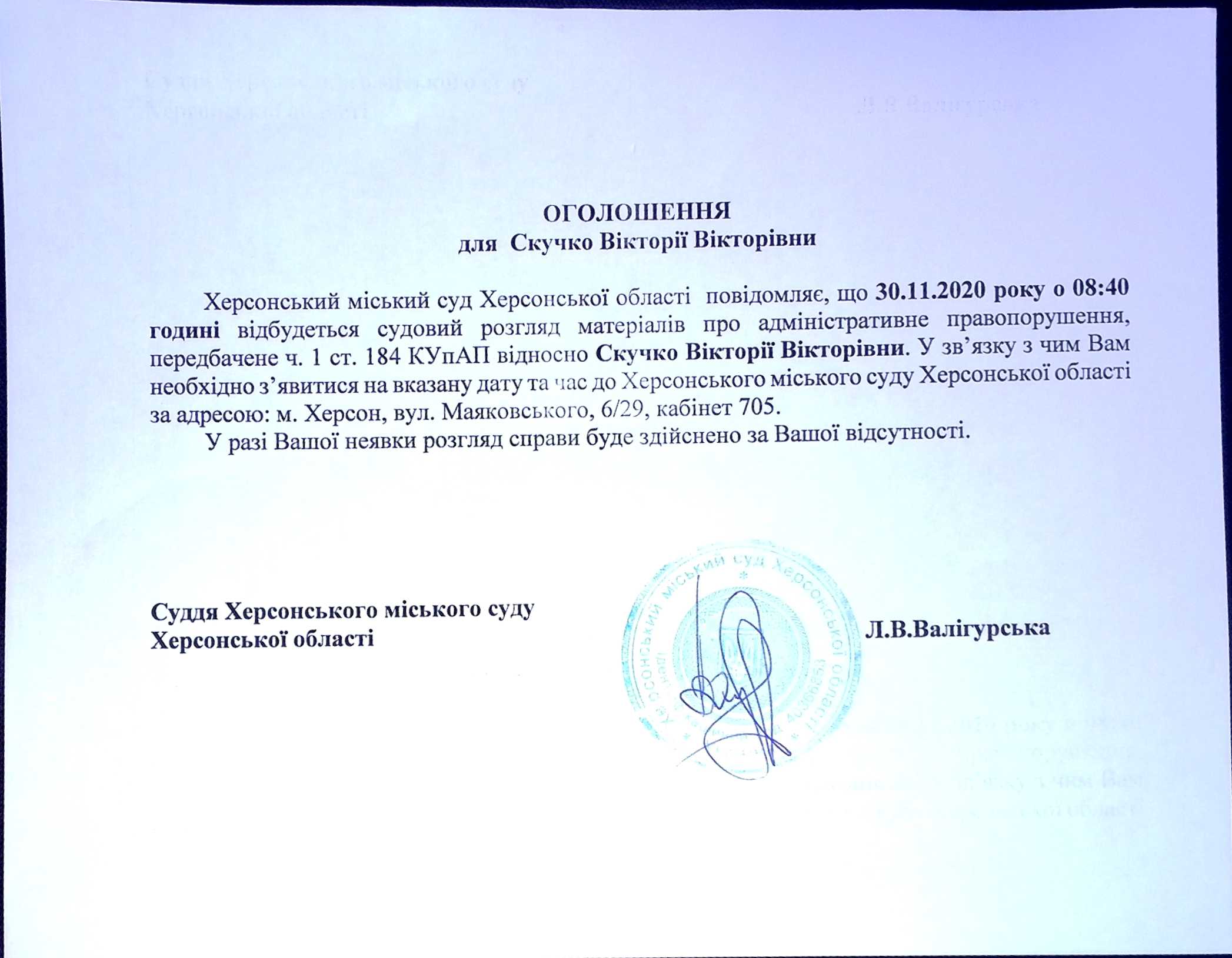 ОГОЛОШЕННЯ для Скучко Вікторії Вікторівни