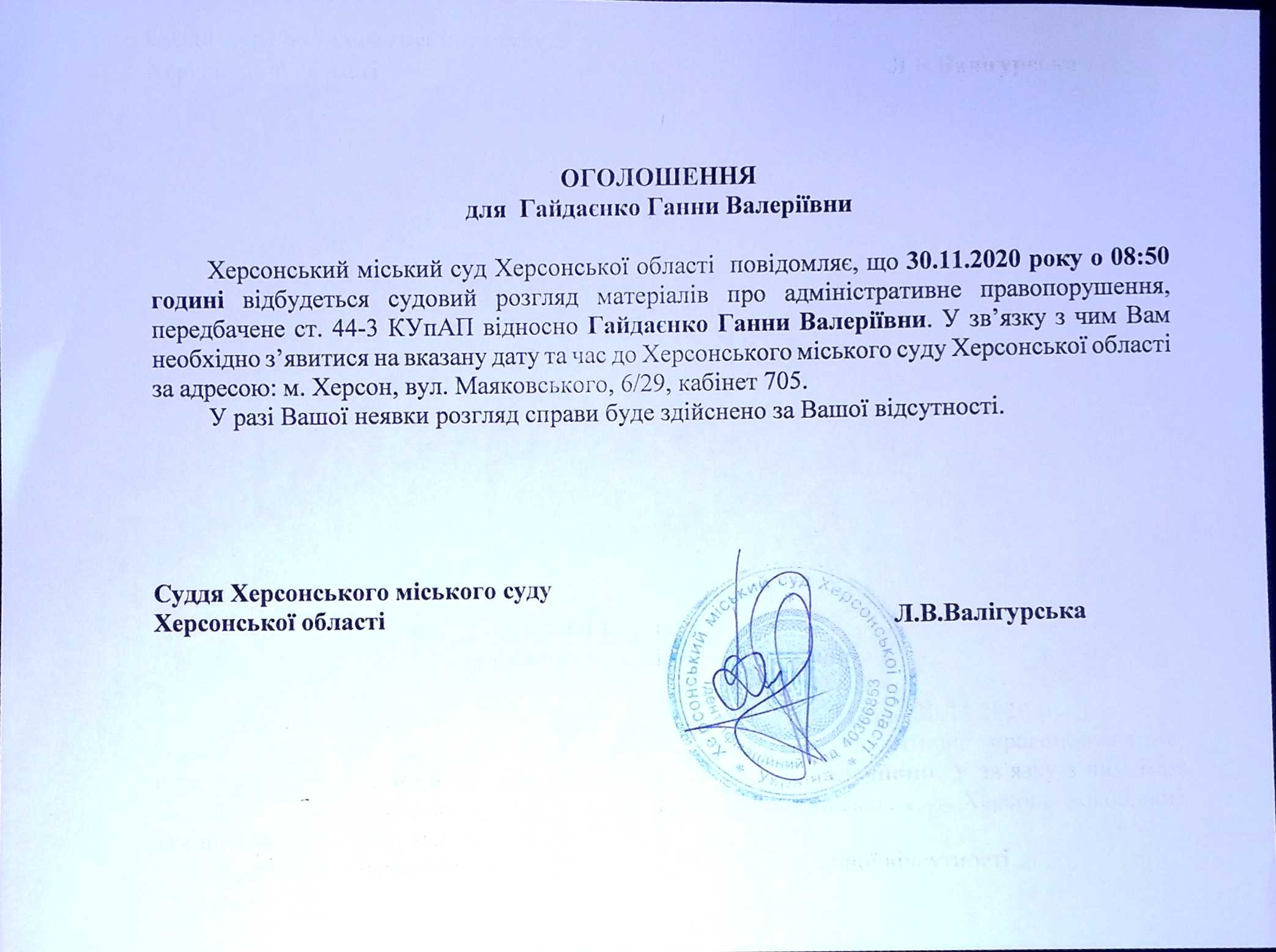 ОГОЛОШЕННЯ для Гайдаєнко Ганни Валеріївни