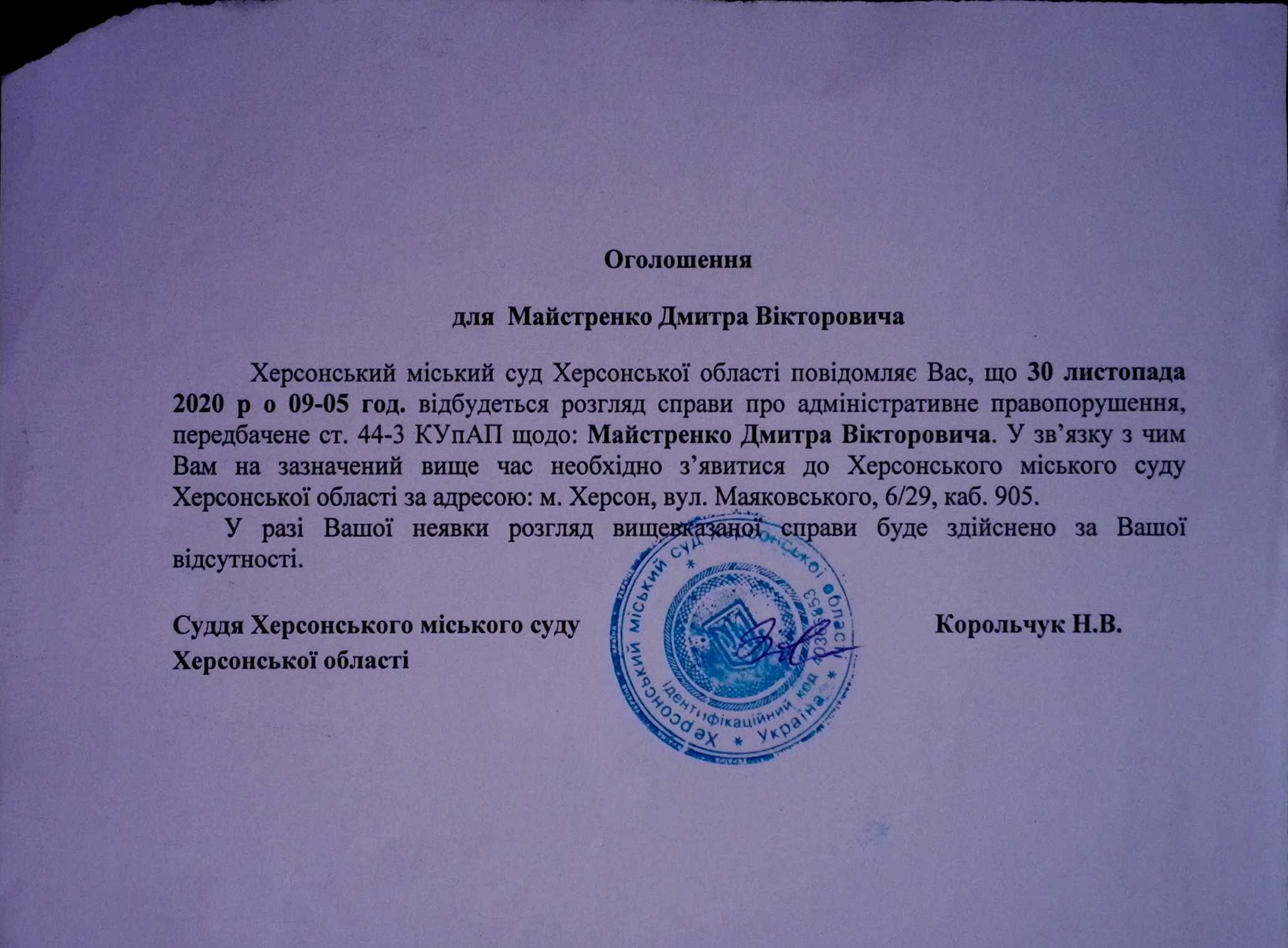 ОГОЛОШЕННЯ для Майстренко Дмитра Вікторовича