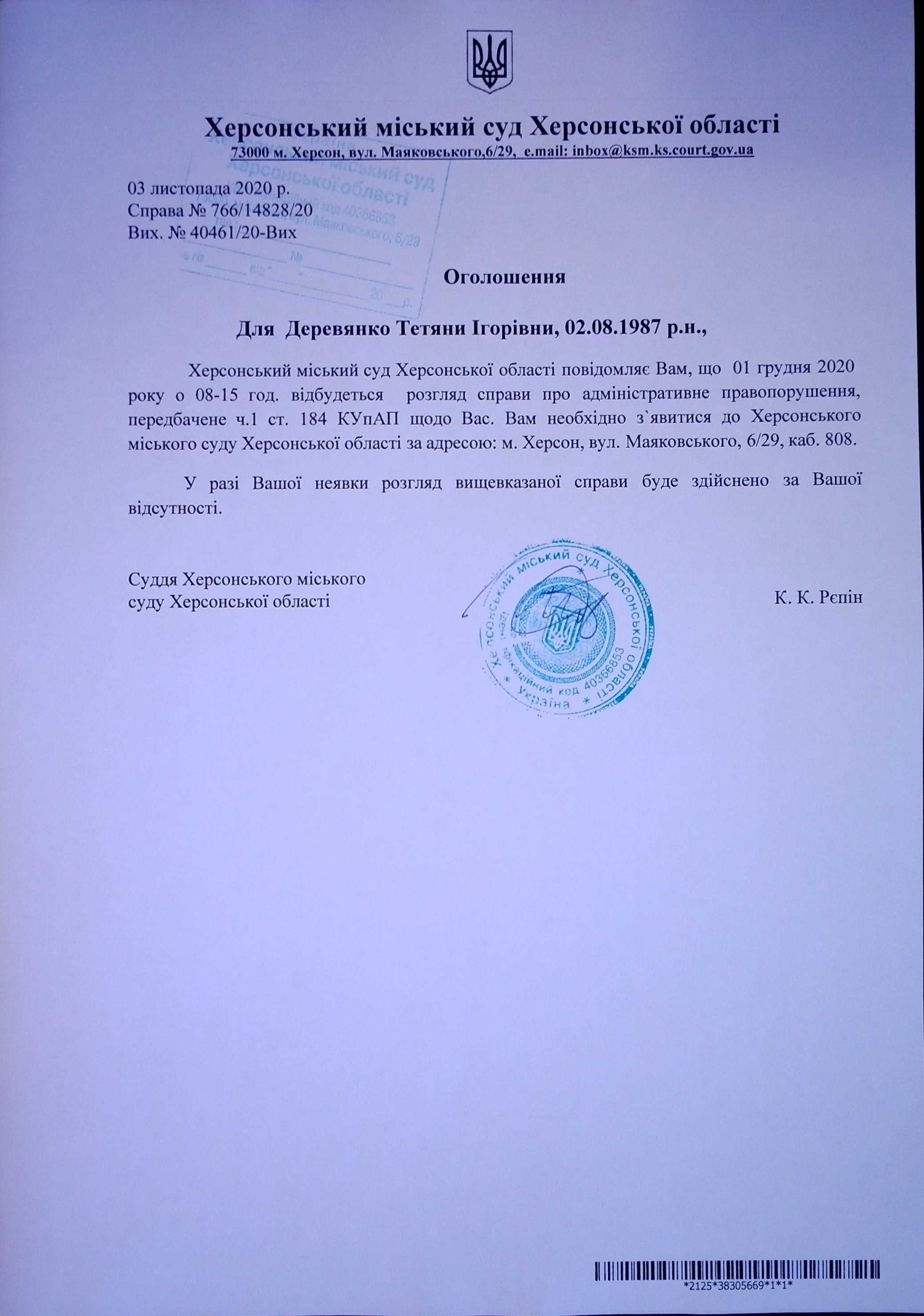 ОГОЛОШЕННЯ для Деревянко Тетяни Ігорівни