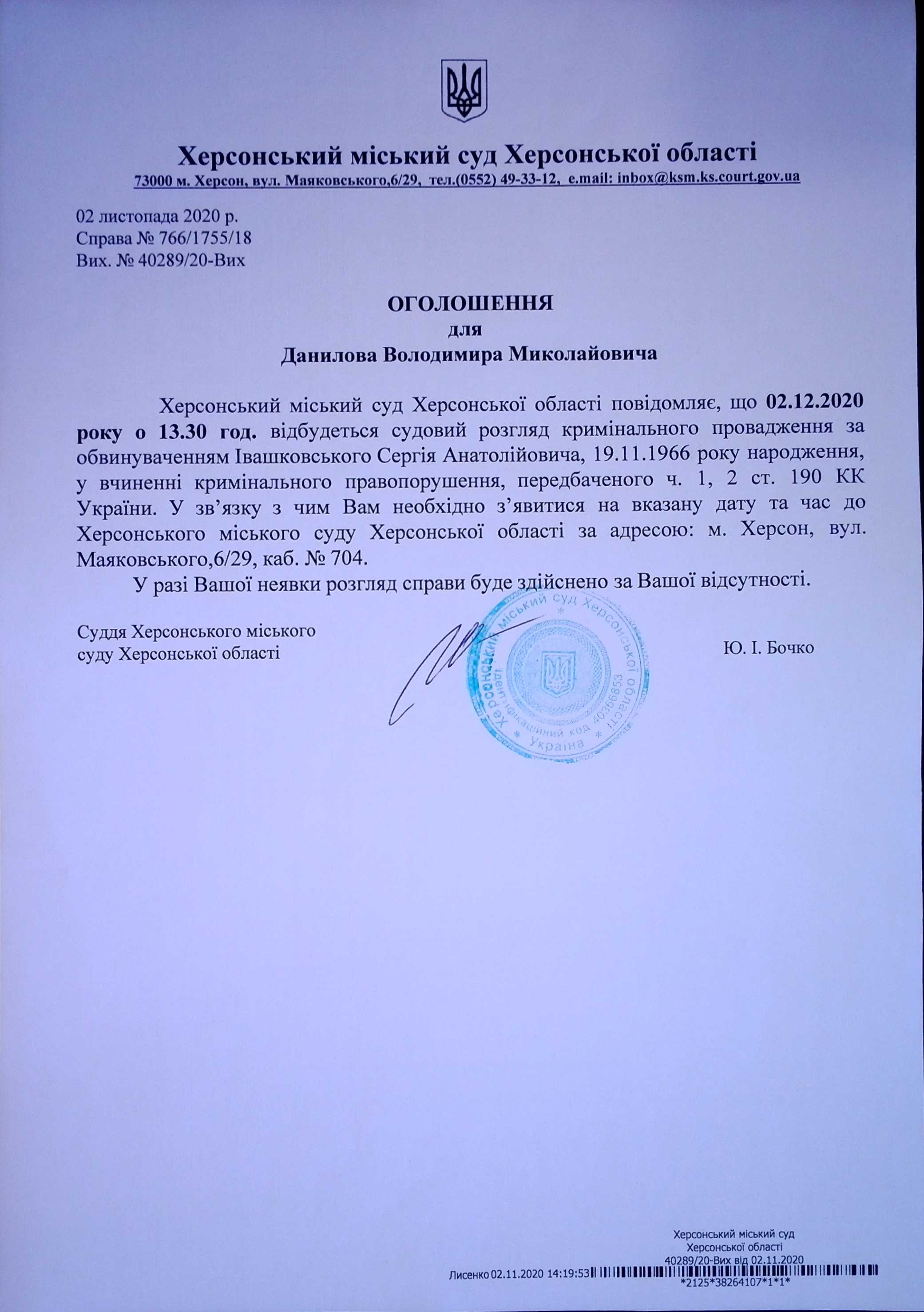 ОГОЛОШЕННЯ для Данилова Володимира Миколайовича