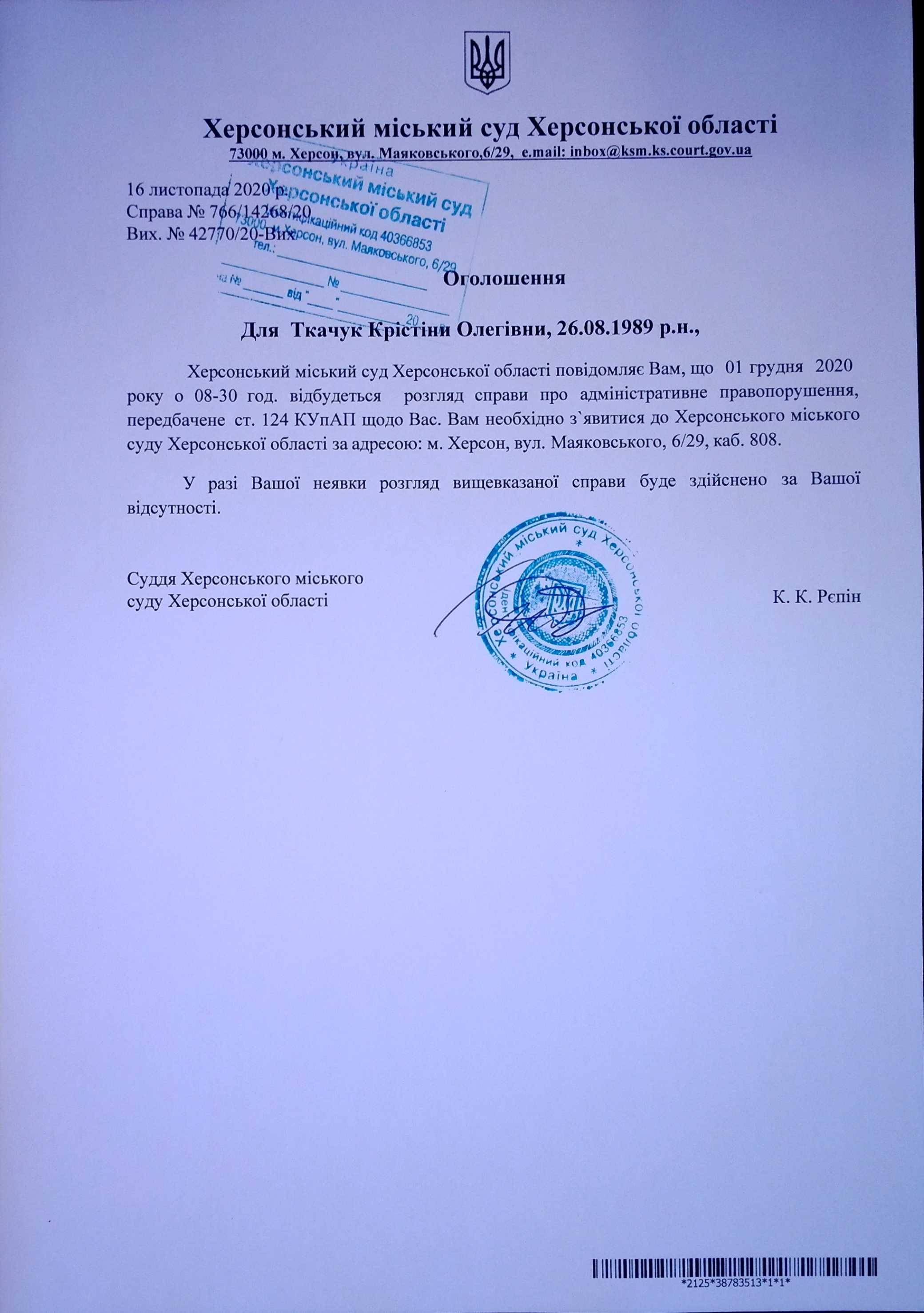 ОГОЛОШЕННЯ для Ткачук Крістіни Олегівни